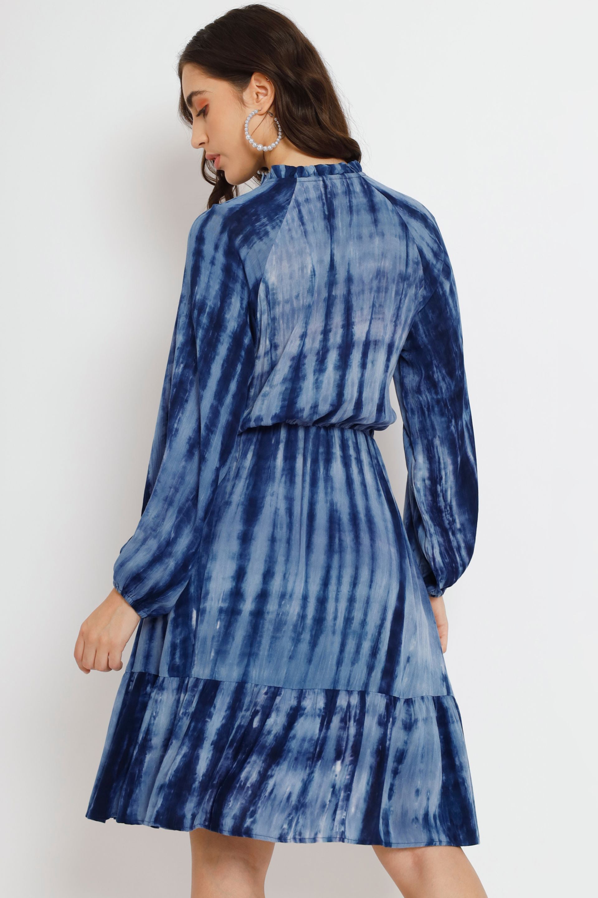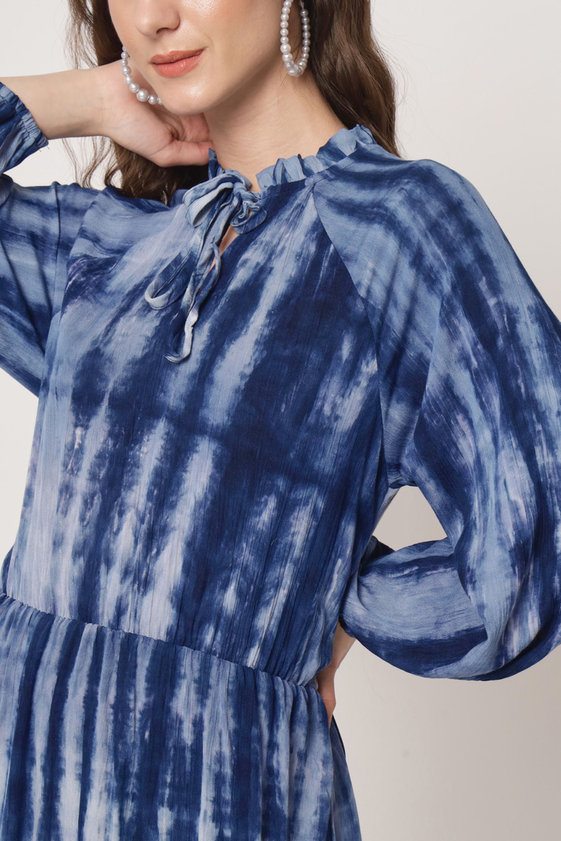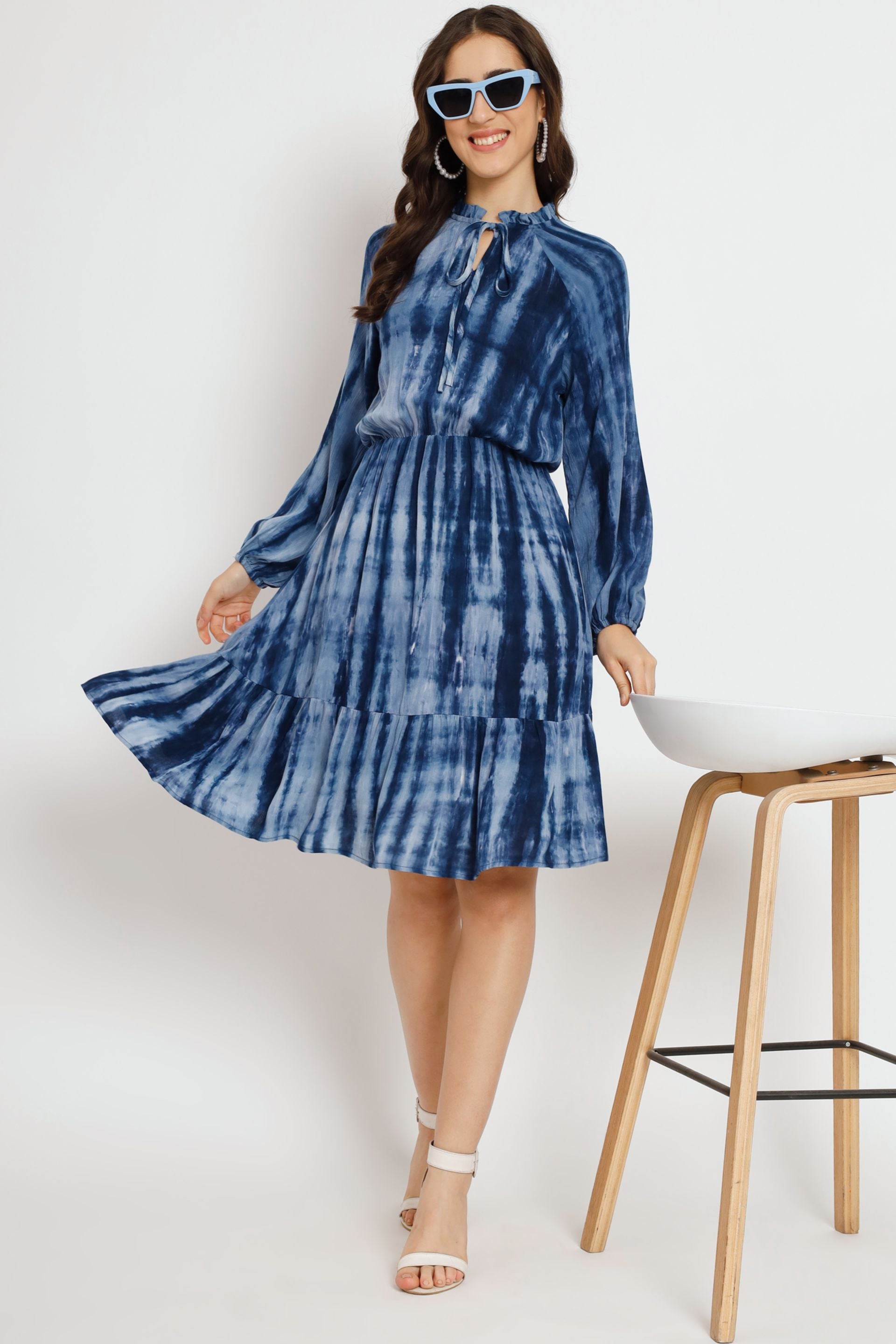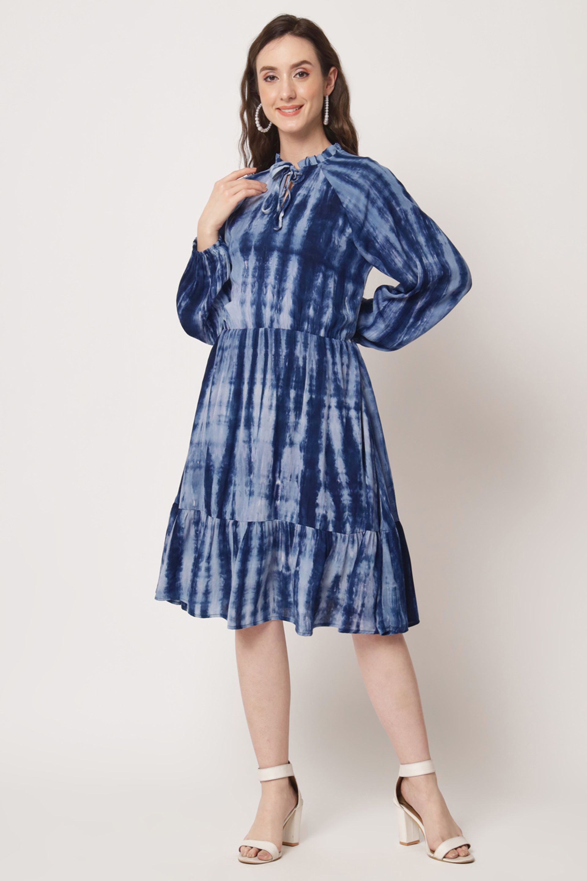 Elevate your wardrobe with our stunning printed dress, designed to make a statement. this knee-length fit and flare dress features a charming tie-up neck and playful puff sleeves, offering a perfect blend of comfort and style. the unique tie-dye pattern adds a touch of artistic flair, making it ideal for both casual outings and special occasions. embrace effortless elegance and versatility with this must-have piece that will surely turn heads wherever you go.