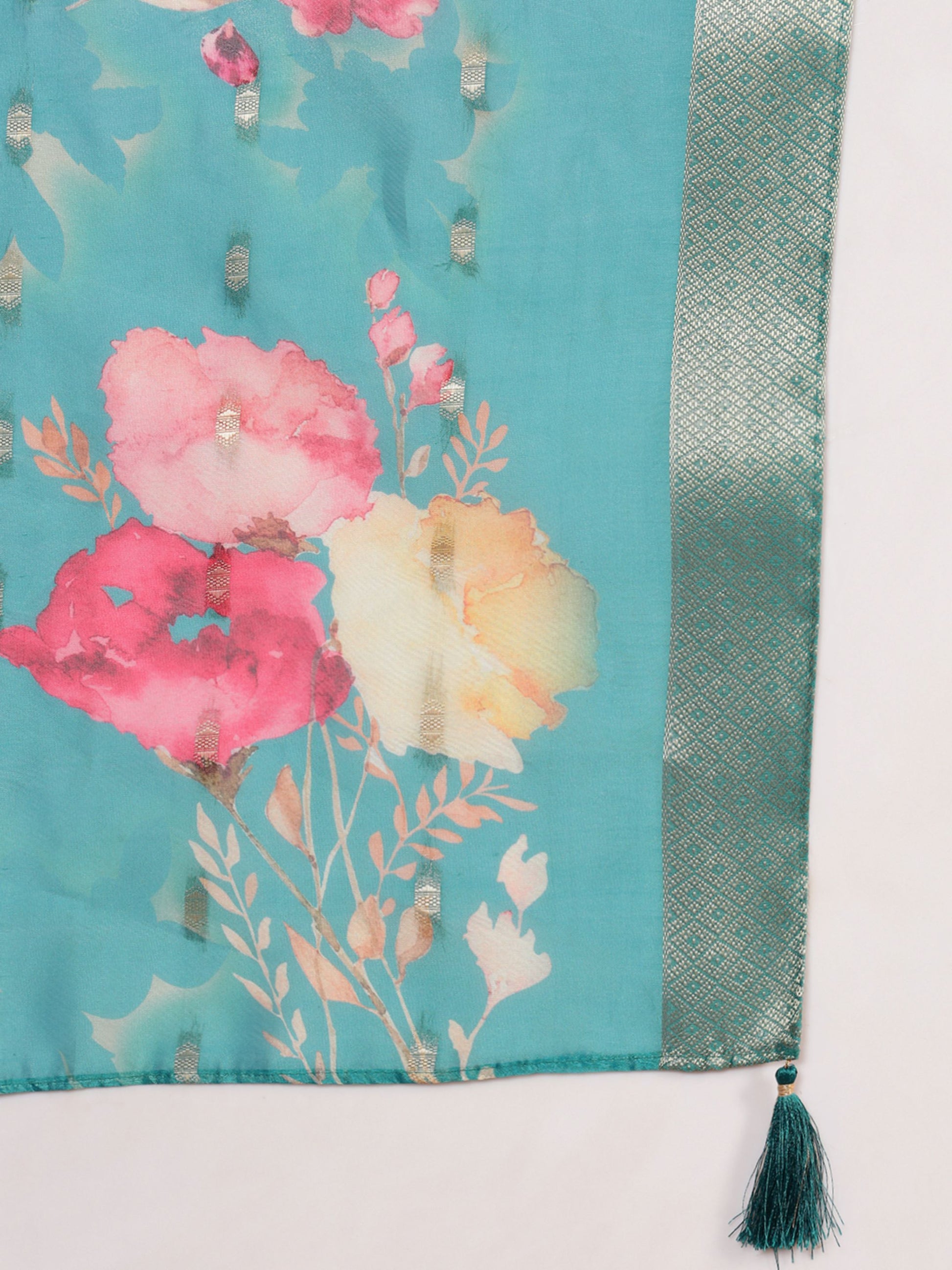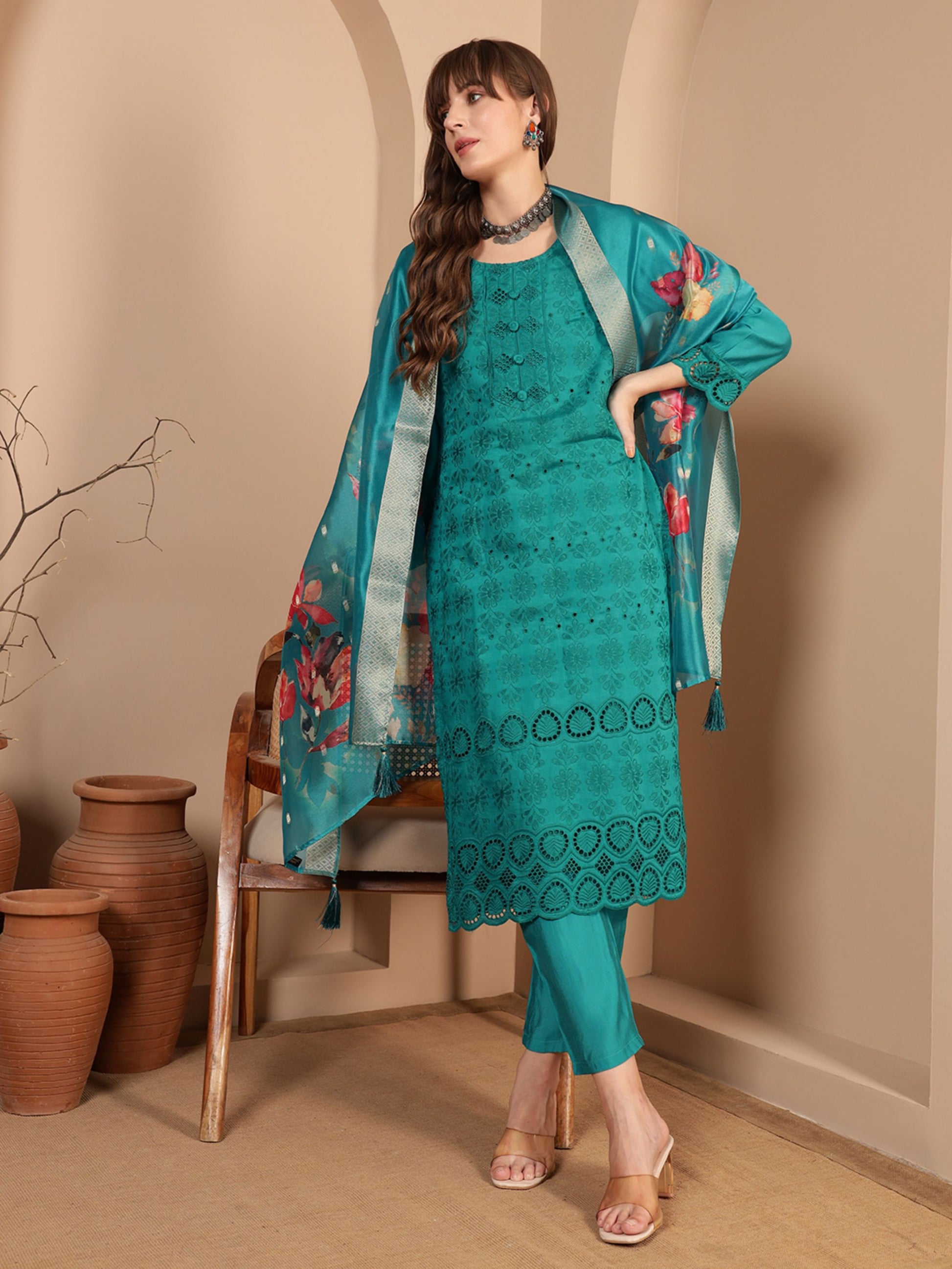 Dark Cyan Embroidered Viscose Women's Kurta, Pyjama & Dupatta Set