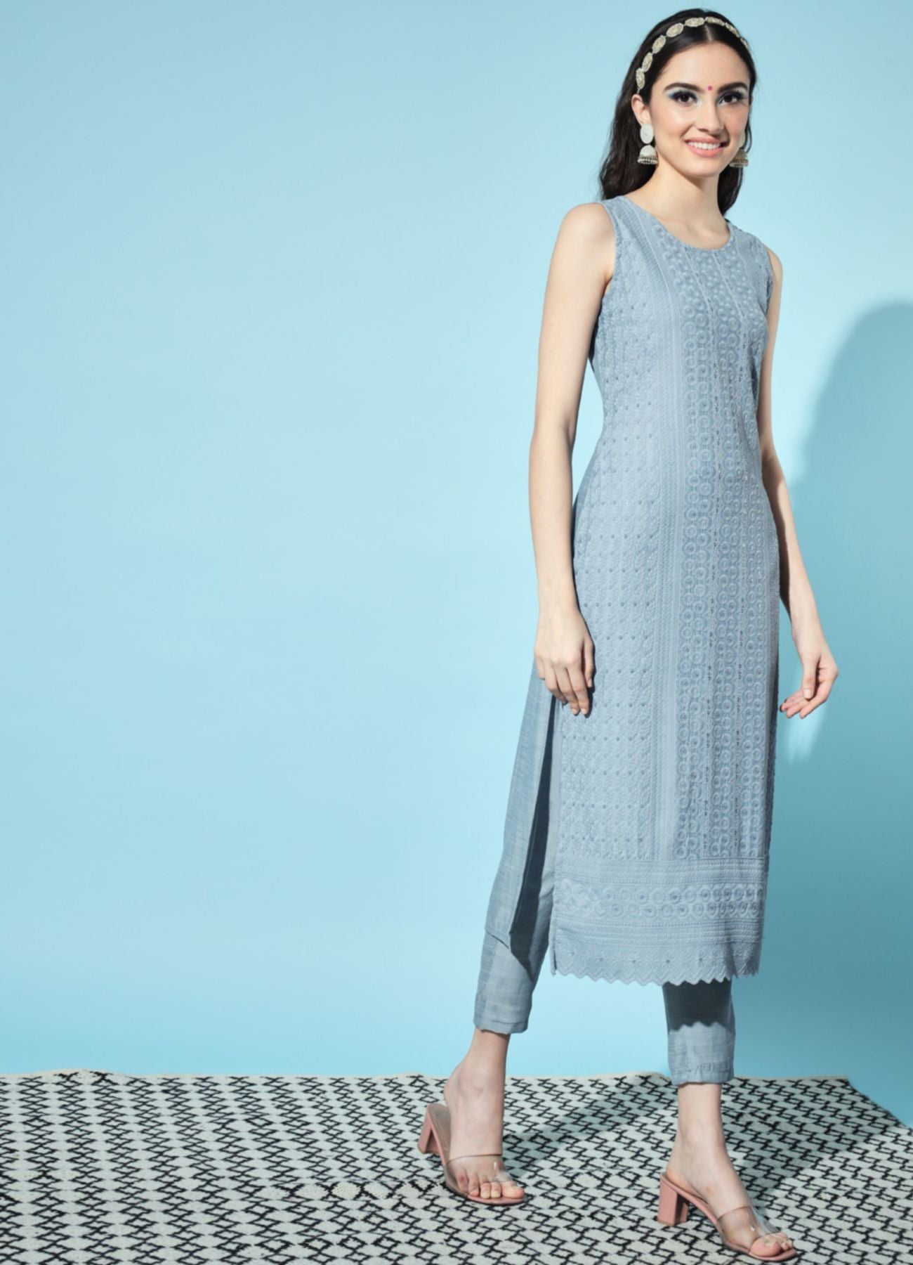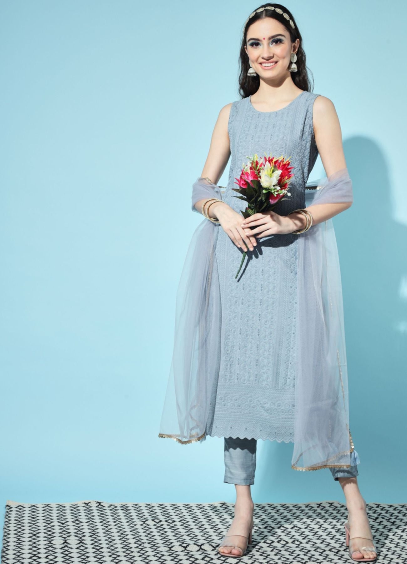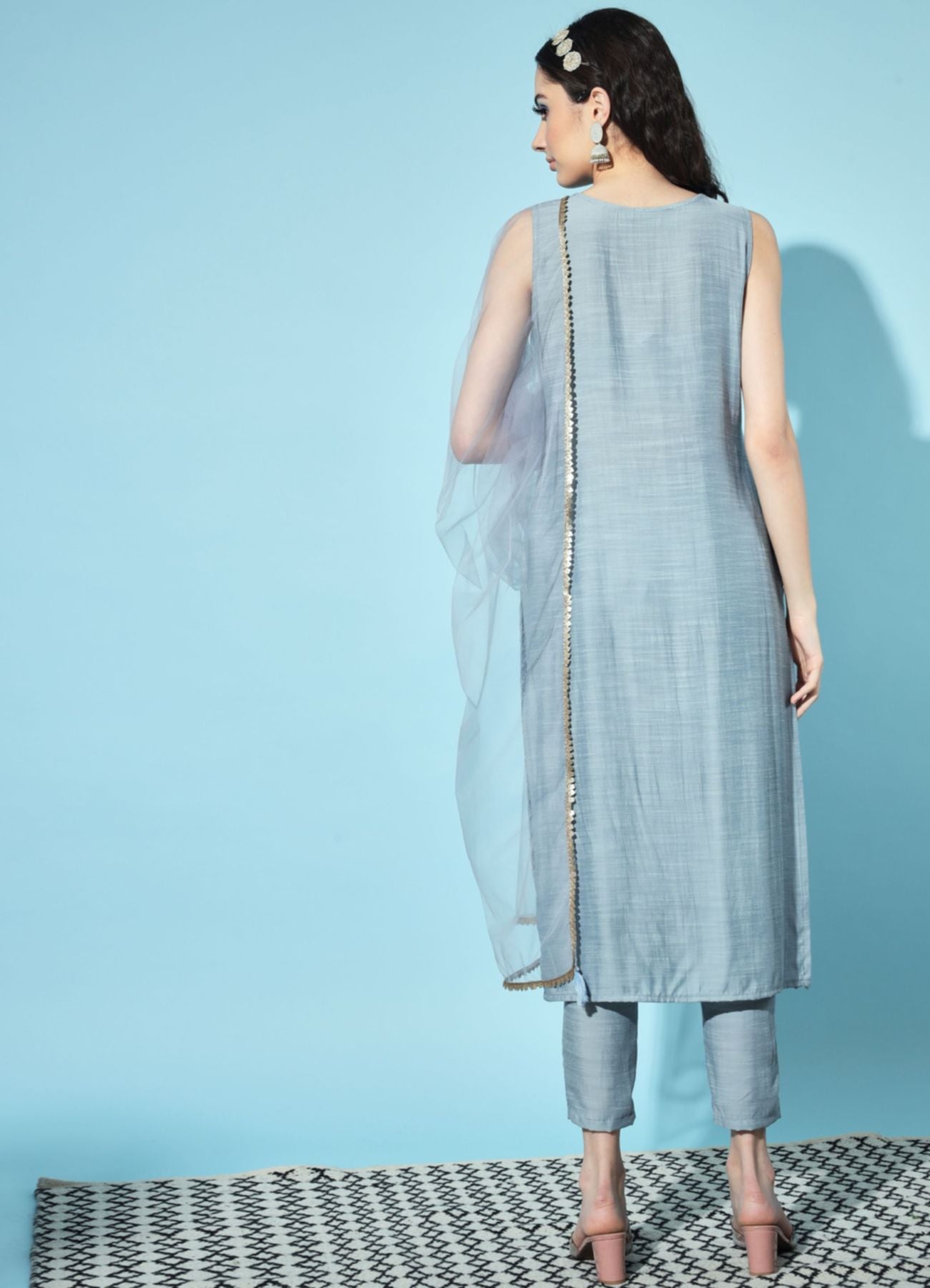 Elevate your ethnic wardrobe with this stunning embroidered kurta suit, designed to make a statement at any occasion. The calf-length kurta features intricate embroidery and sequinned ornamentation, complemented by a flattering round neck and sleeveless design for a chic look. Paired with solid, slip-on pants that offer comfort with an elasticated waistband, this ensemble is both stylish and practical. The included solid dupatta, adorned with playful tassels, adds a touch of elegance to your outfit. Perfect for festive celebrations or casual gatherings, this kurta suit is a must-have for the modern woman who values both tradition and style.