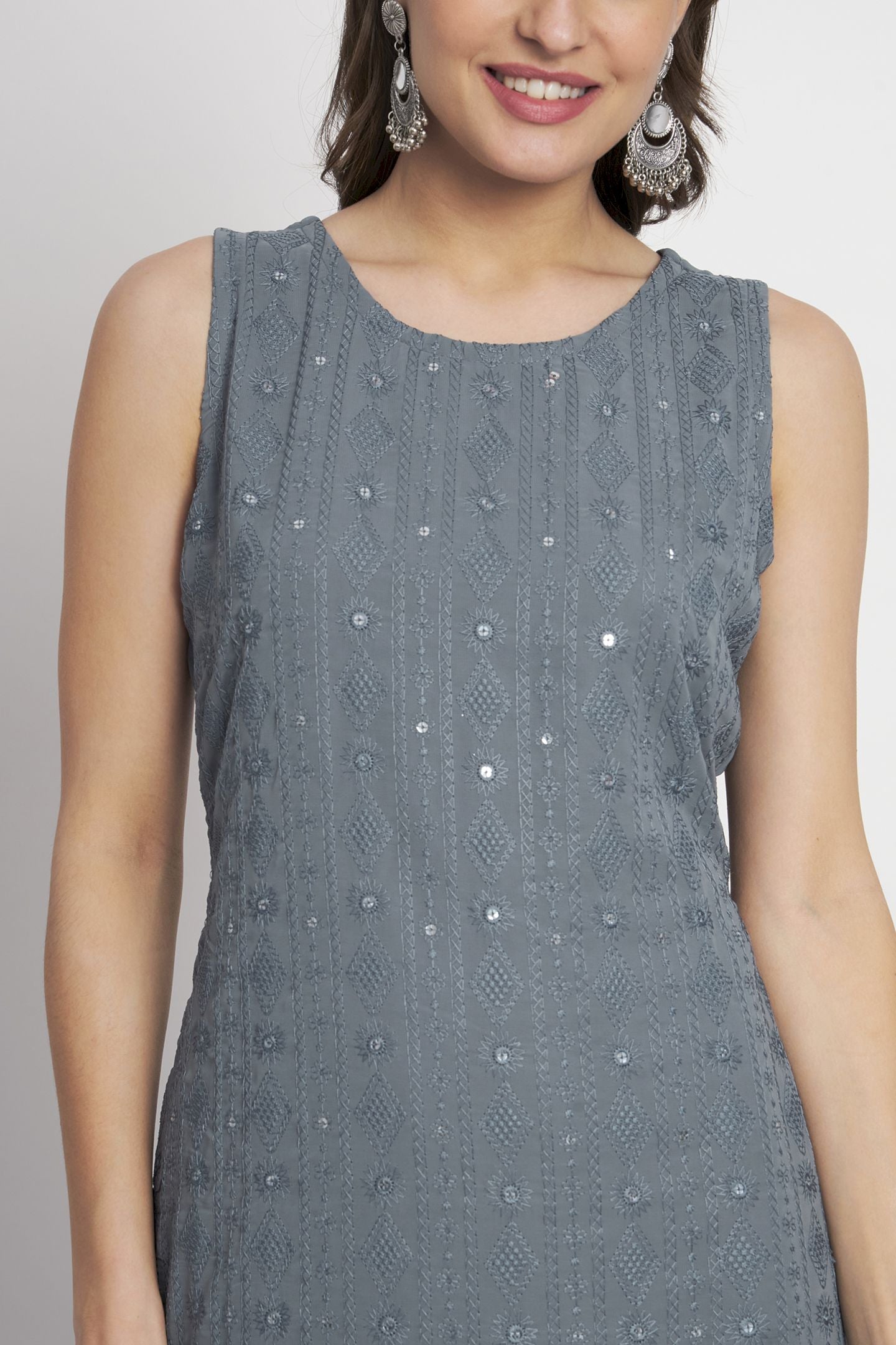 Elevate your wardrobe with our exquisite embroidered kurta set, designed for elegance and comfort. The calf-length kurta features intricate embroidery and sequined ornamentation, complemented by a flattering round neck and sleeveless design. Paired with solid palazzo pants that offer a slip-on closure and an elasticated waistband for a perfect fit, this ensemble ensures both style and ease. The matching dupatta, adorned with charming tassels, adds a touch of sophistication to your look. Perfect for festive occasions or casual gatherings, this outfit is a must-have for the modern woman seeking grace and versatility.