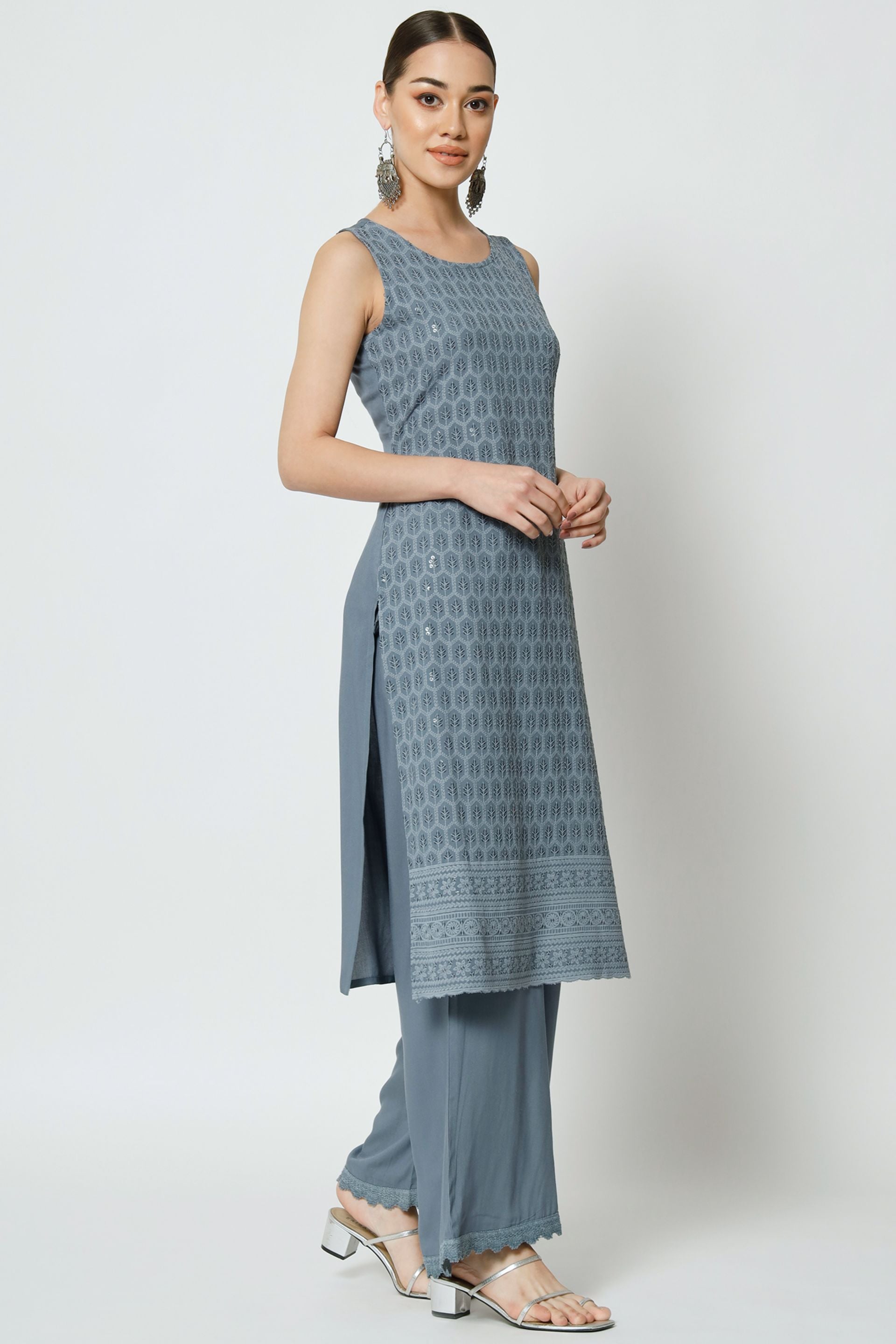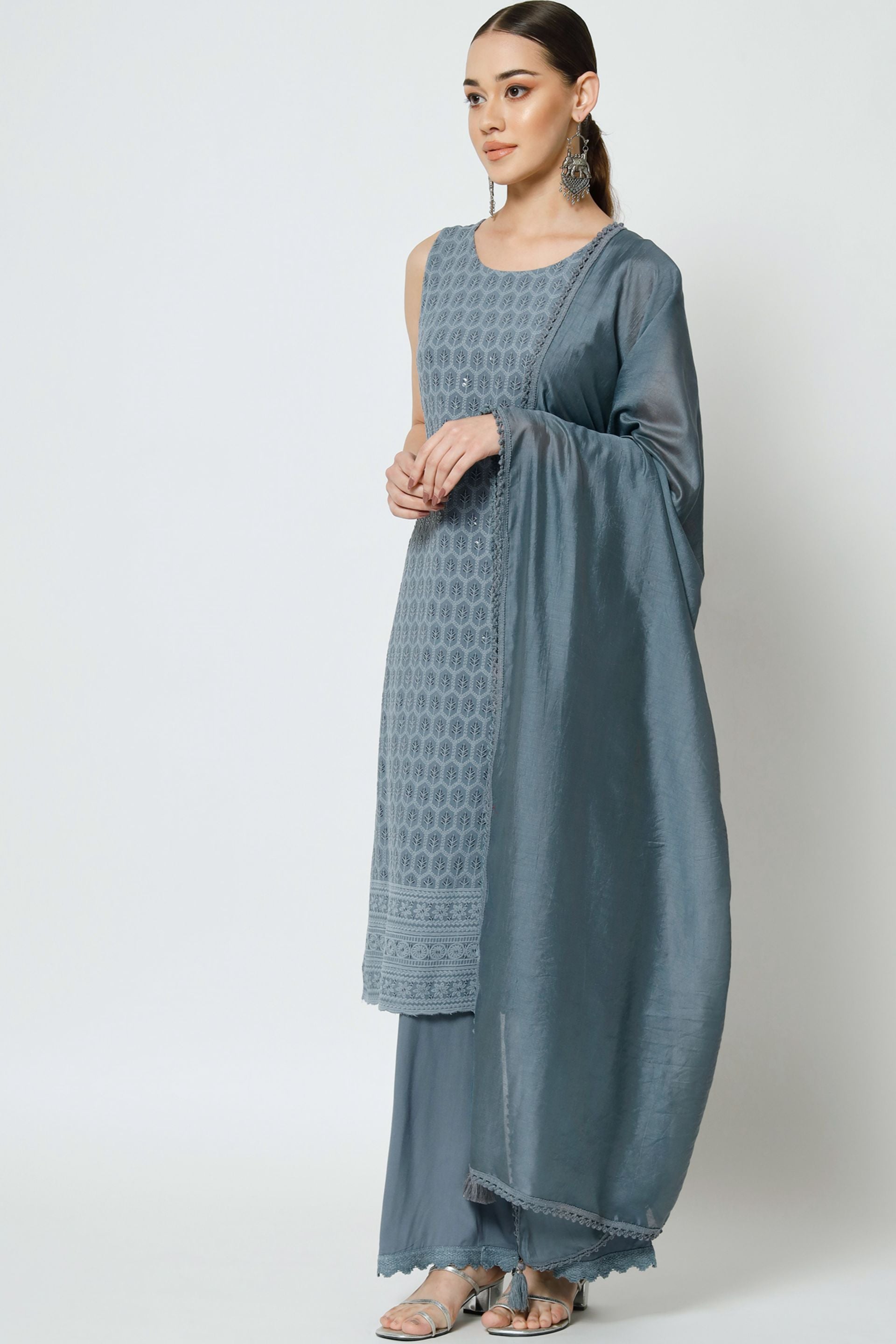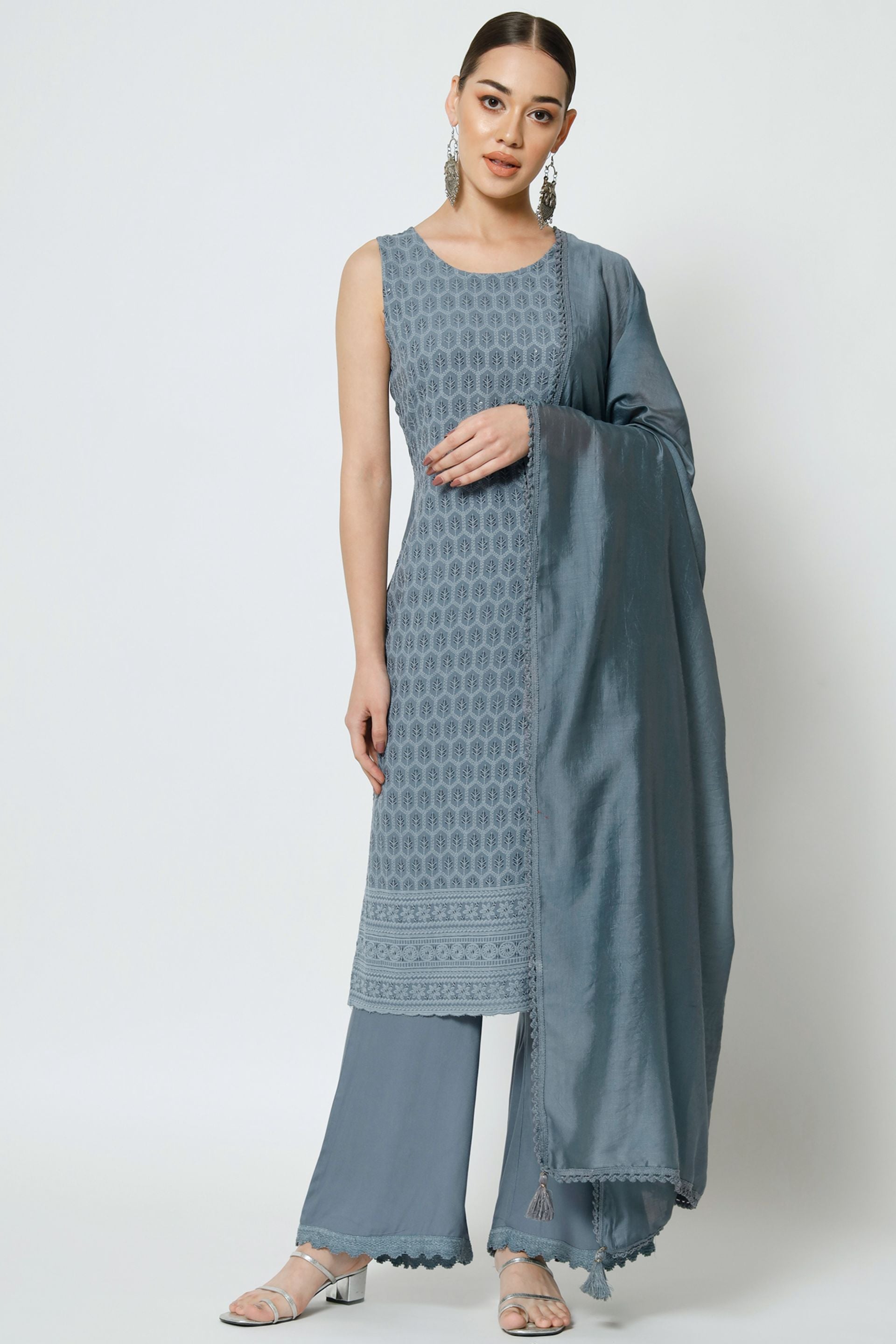 Elevate your ethnic wardrobe with this stunning embroidered suit, featuring a beautifully crafted calf-length kurta adorned with intricate embroidery and sequined details. The straight silhouette and round neck design offer a flattering fit, while the sleeveless style adds a touch of modern elegance. Paired with solid palazzo pants that boast an elasticated waistband for ultimate comfort, this ensemble is perfect for any festive occasion. Complete your look with the included solid dupatta, elegantly finished with tassel borders, making it a versatile addition to your collection. Embrace sophistication and style with this exquisite outfit that promises to turn heads wherever you go.