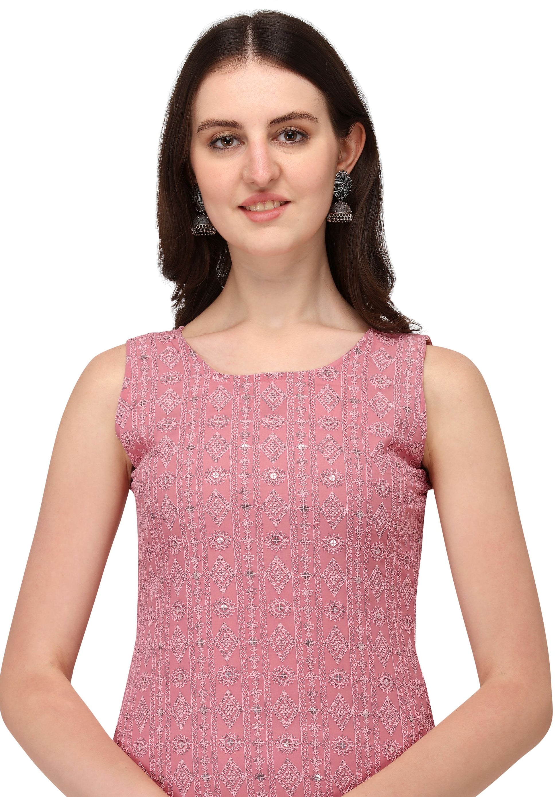 Elevate your wardrobe with our stunning kurta, crafted from soft, breathable cotton for all-day comfort. This calf-length kurta features a beautiful floral print adorned with delicate lace patterns and sequined ornamentation, adding a touch of elegance to your look. The straight shape and round neck create a flattering silhouette, while the sleeveless design keeps you cool and stylish. Pair it effortlessly with the solid palazzo bottoms, designed with an elasticated waistband for a perfect fit and easy slip-on closure. Embrace sophistication and grace with this exquisite ensemble, perfect for any occasion.