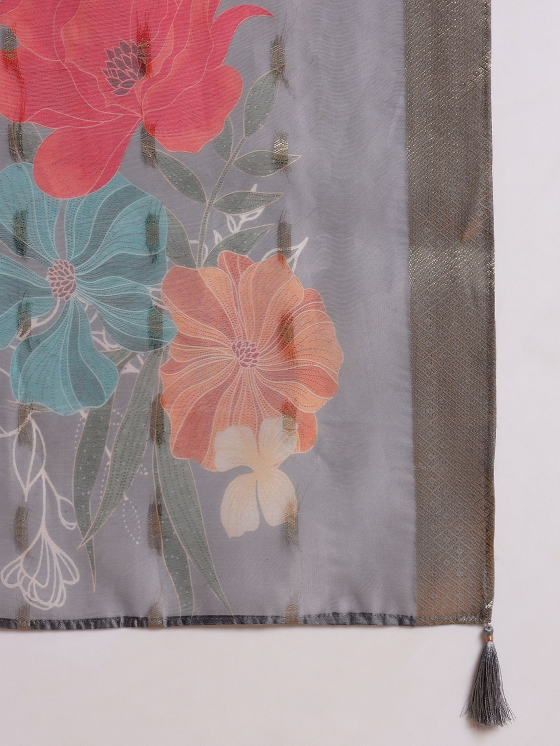 Fossil Grey Embroidered Silk Women's Kurta, Pyjama & Dupatta Set