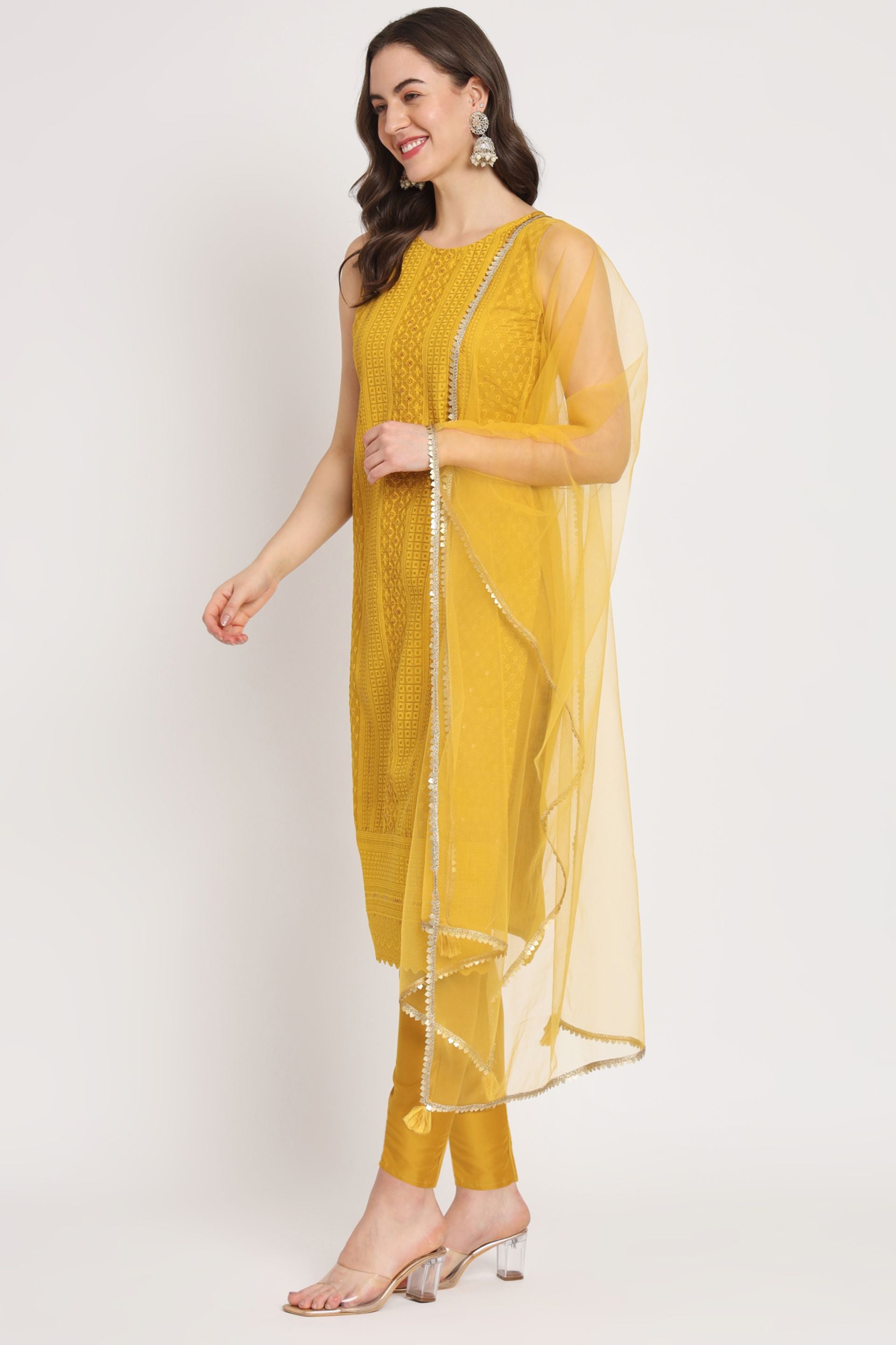 Elevate your party wardrobe with this stunning kurta set, designed to make a lasting impression. The calf-length kurta features exquisite embroidery and a round neck, complemented by sequinned ornamentation that adds a touch of glamour. Its straight shape and sleeveless design ensure a flattering fit, while the solid-patterned pants with an elasticated waistband provide comfort and ease of movement. Complete your look with the included solid dupatta, adorned with stylish tassels, perfect for draping or styling as you desire. This ensemble is not just a choice; it's a statement of elegance and sophistication for any festive occasion.