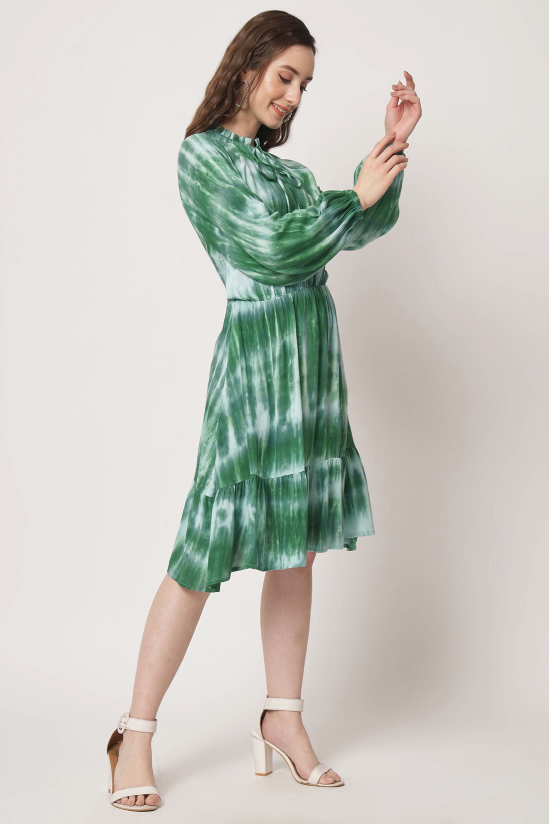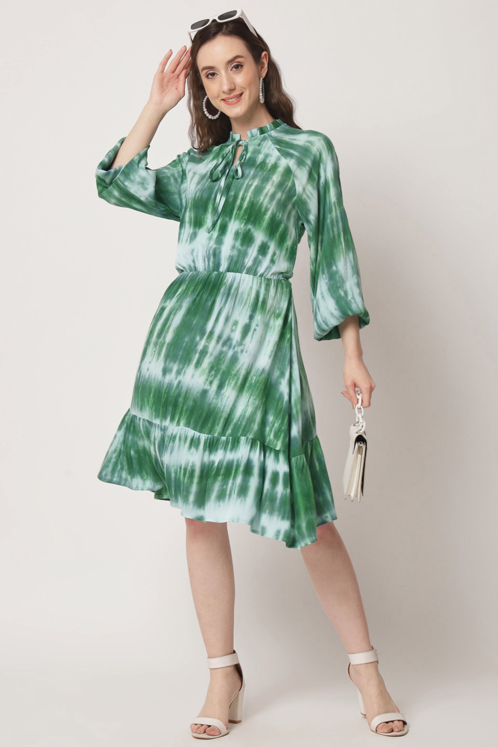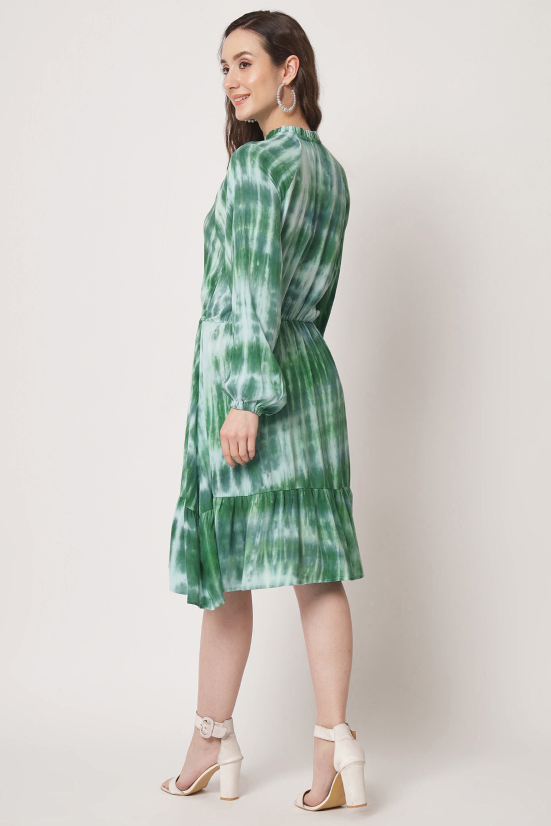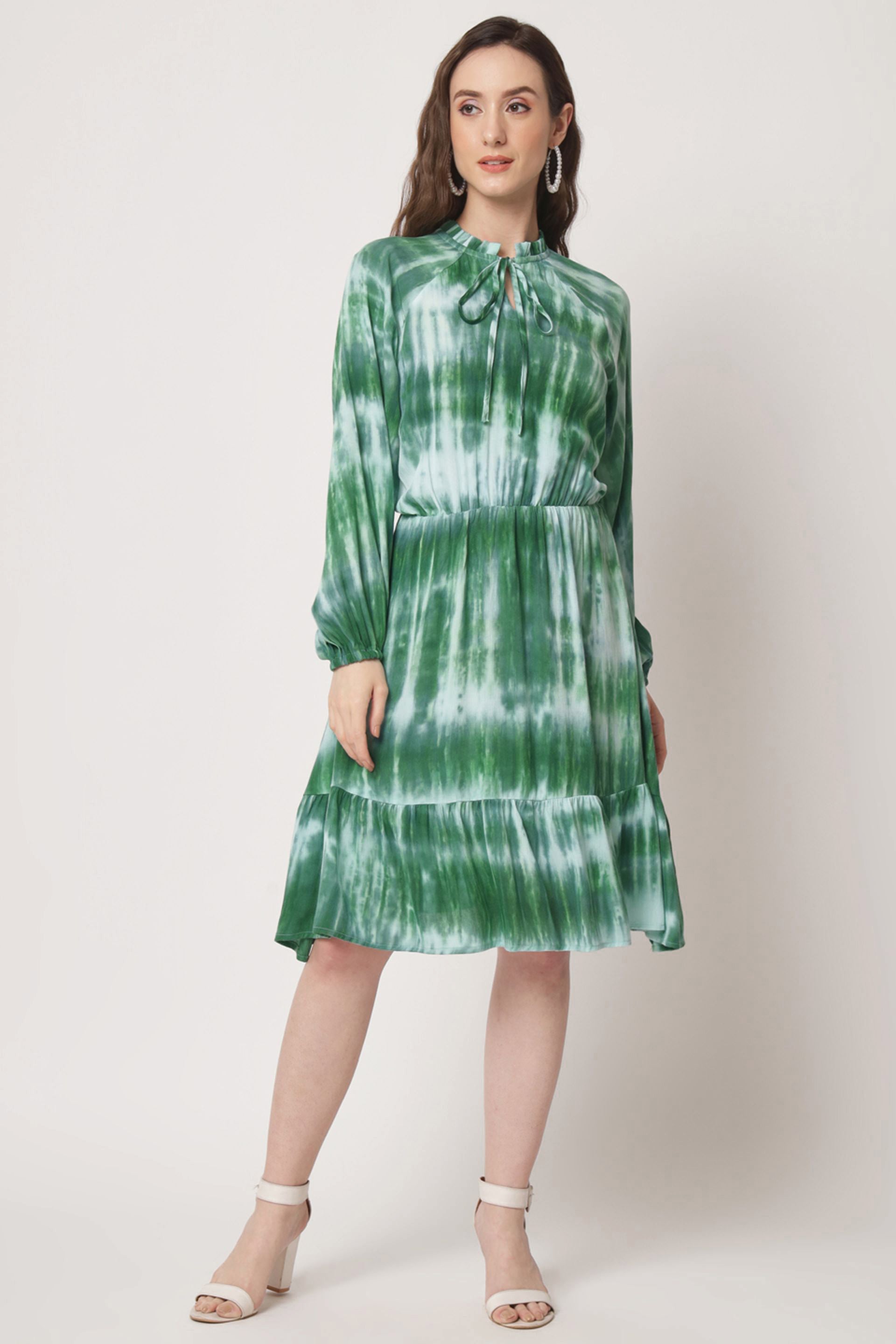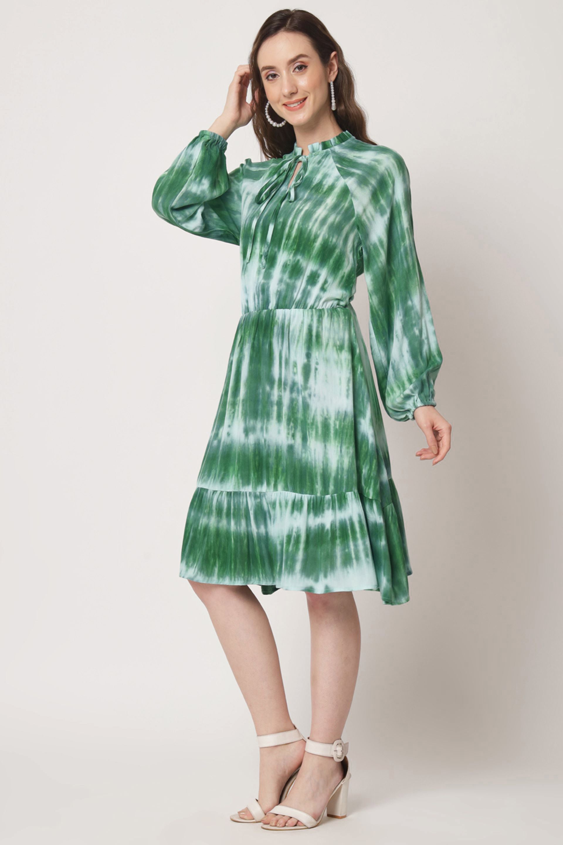 Elevate your wardrobe with our stunning printed dress, designed to make a statement. this knee-length fit and flare dress features a charming tie-up neck and playful puff sleeves, offering a perfect blend of comfort and style. the unique tie-dye pattern adds a touch of artistic flair, making it ideal for both casual outings and special occasions. embrace effortless elegance and versatility with this must-have piece that will surely turn heads wherever you go.