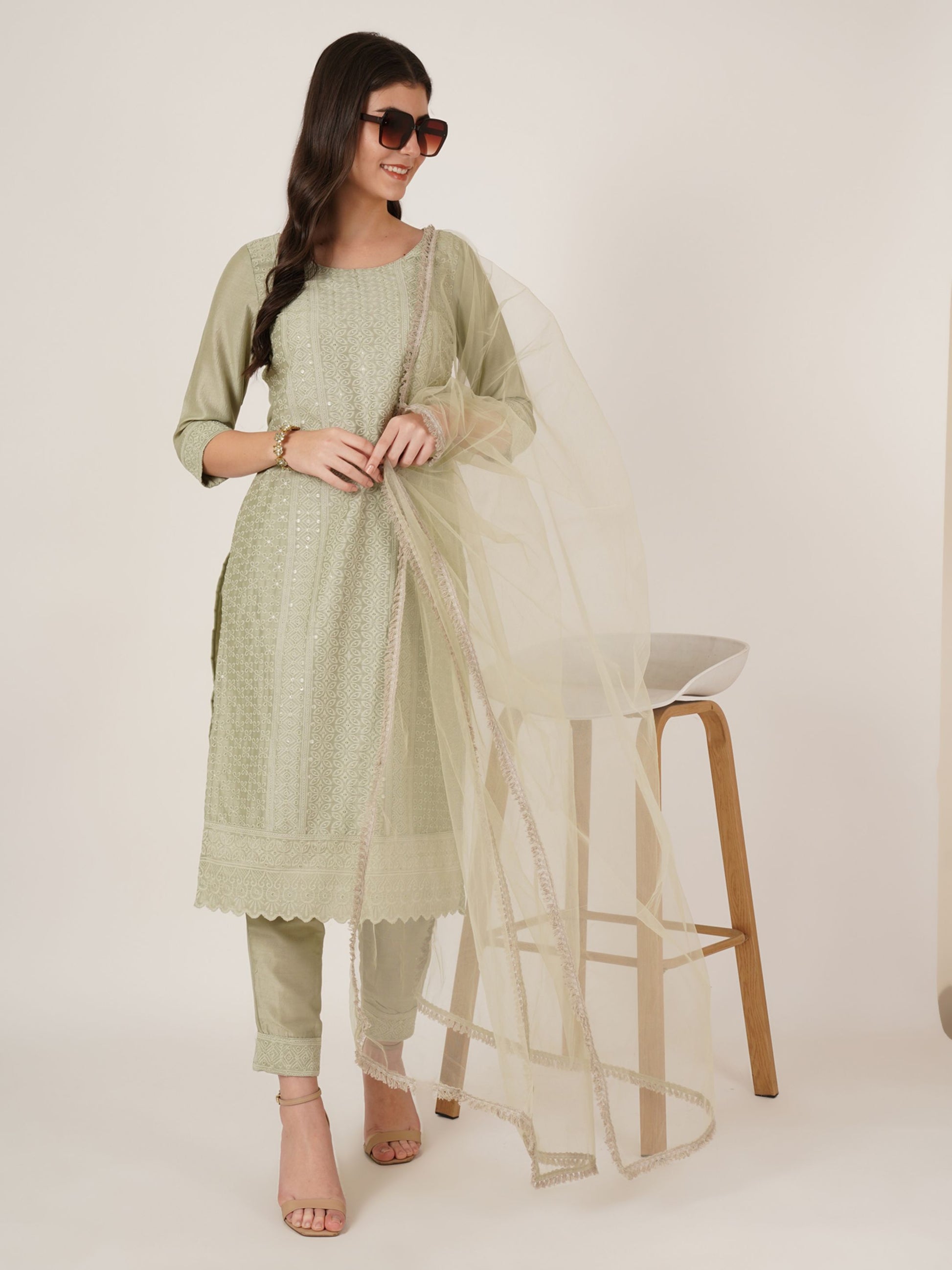 Women's Embroidered Silk Blend Kurta Pyjama & Dupatta Set