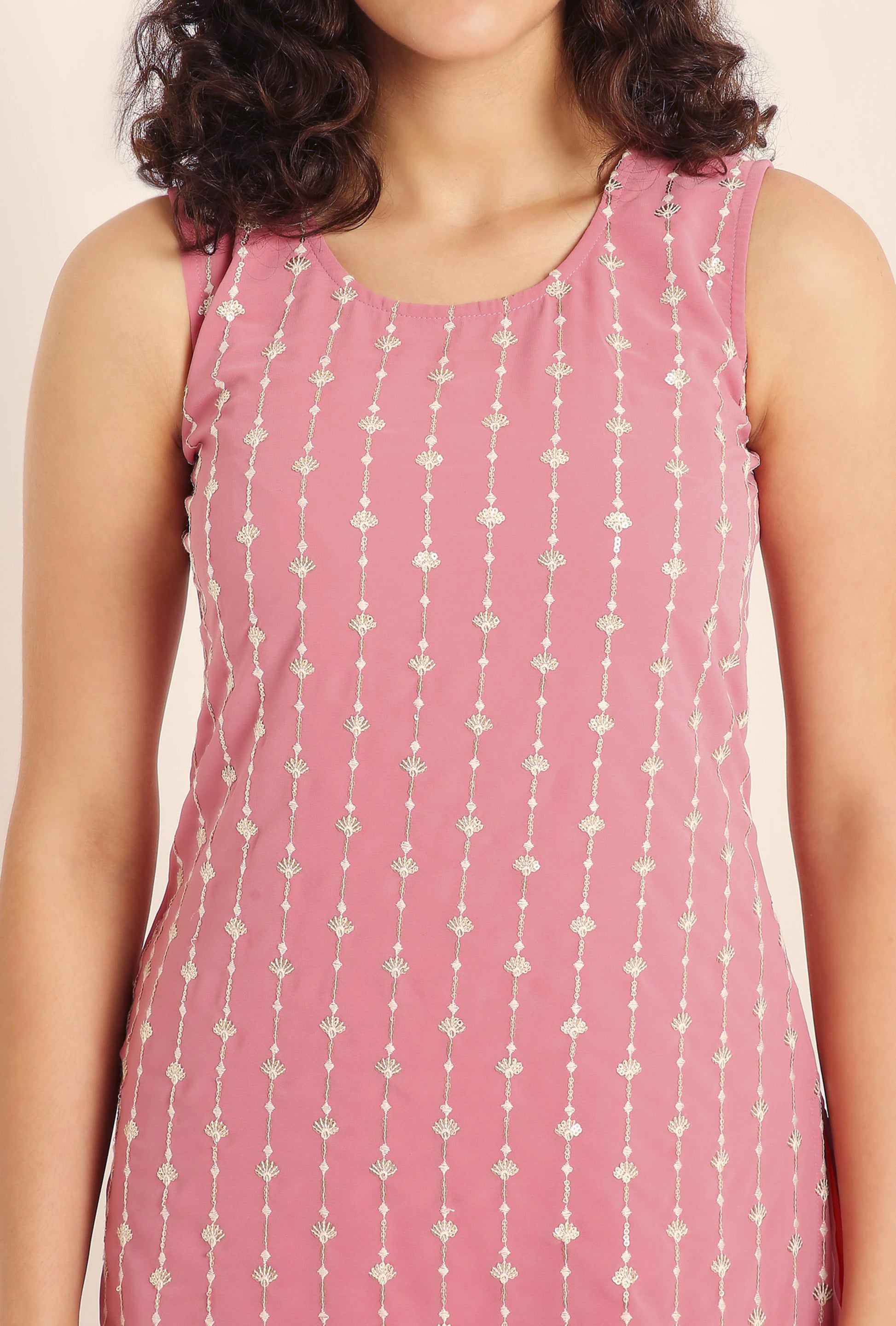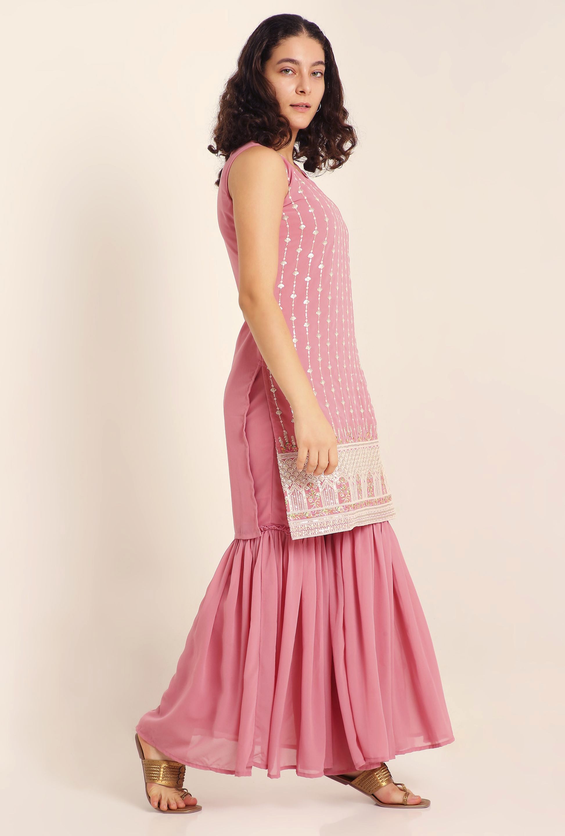 Elevate your wardrobe with our stunning embroidered georgette suit, featuring a chic kurta sharara set that’s perfect for any occasion. Crafted from lightweight georgette, the sleeveless straight kurta boasts a flattering round neckline and a sleek straight hemline, ensuring you look effortlessly stylish. The sharara comes with an elasticated waist for ultimate comfort, while the matching dupatta, adorned with playful tassels, ties the whole look together beautifully. Whether it’s a festive celebration or a casual outing, this ensemble is your go-to choice for a touch of elegance and charm.