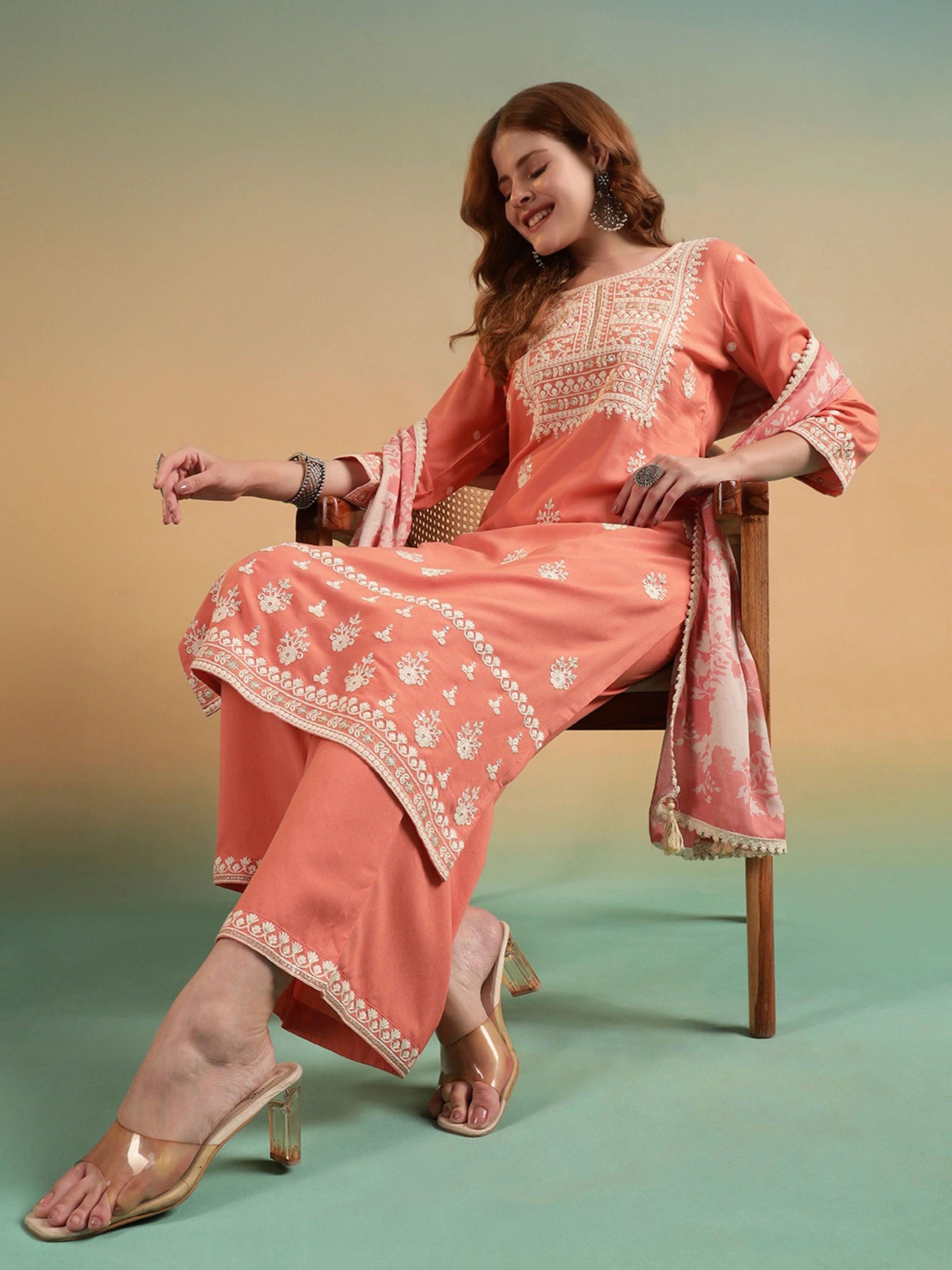 Peach Embroidered Rayon Women's Kurta and Palazzo Set