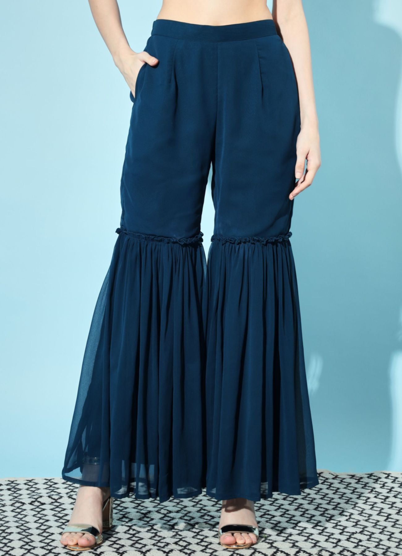 Elevate your ethnic wardrobe with our stunning navy blue embroidered georgette kurta, designed to make a statement at any occasion. The knee-length kurta features intricate embroidery and sequinned ornamentation, complemented by a flattering straight shape and a classic round neck. The sleeveless design adds a touch of elegance, while the solid sharara bottom with an elasticated waistband ensures comfort and ease of wear. Complete with a matching solid dupatta adorned with playful tassels, this ensemble is perfect for festive celebrations or special gatherings. Embrace sophistication and style with this exquisite outfit that promises to turn heads.
