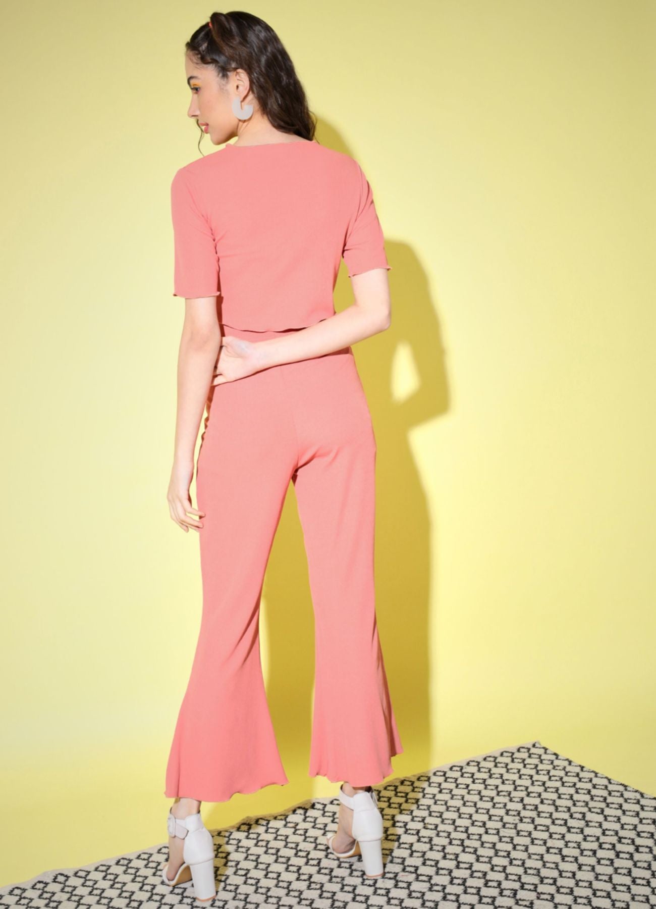 Elevate your wardrobe with our Cropped Top and Flared Pants Set, a perfect blend of style and comfort. The solid crop top features a flattering round neck and short sleeves, designed to accentuate your silhouette while keeping you cool and chic. Paired with elasticated flared trousers, this set offers a relaxed fit that effortlessly transitions from day to night. Slip into this ensemble for a trendy look that is both versatile and easy to wear, making it an essential addition to your collection.