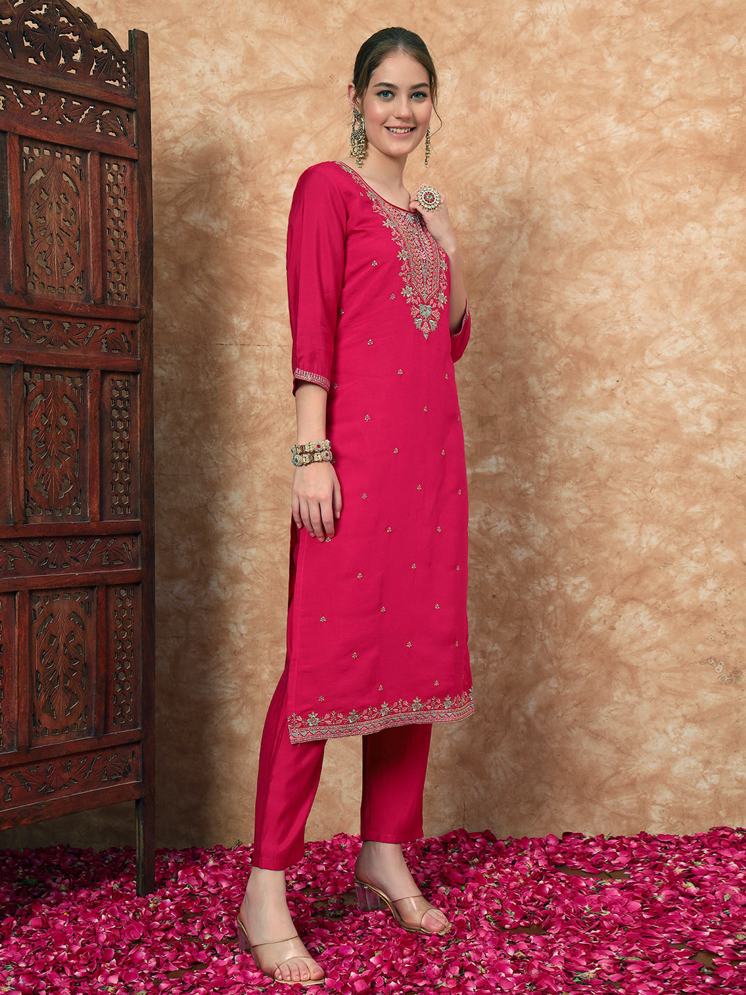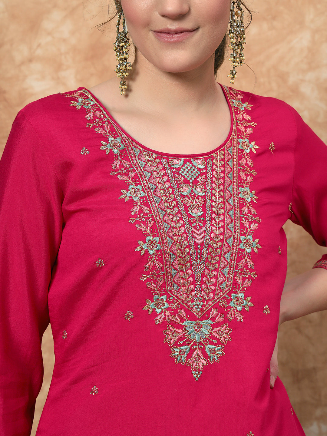 Elevate your wardrobe with our exquisite embroidered pink suit, designed for elegance and comfort. This stunning ensemble features a straight kurta with 3/4 sleeves and a flattering round neck, adorned with intricate embroidery that adds a touch of sophistication. The accompanying dupatta complements the look, making it perfect for both casual outings and special occasions. Embrace style and grace with this versatile outfit that promises to make you stand out effortlessly.