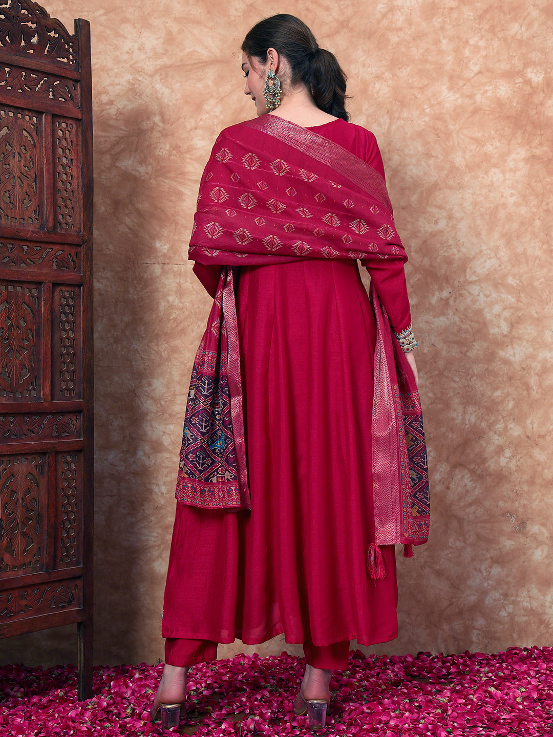 Elevate your ethnic wardrobe with this stunning embroidered anarkali suit, designed to make a statement at any occasion. Crafted from luxurious silk fabric, this flared kurti features intricate embroidery that adds a touch of elegance. The round neck and full sleeves provide a flattering silhouette, while the calf-length kurti paired with a matching pant set ensures comfort and style. Complete with a beautifully adorned dupatta featuring zari tassels, this ensemble is perfect for festive celebrations or special gatherings.