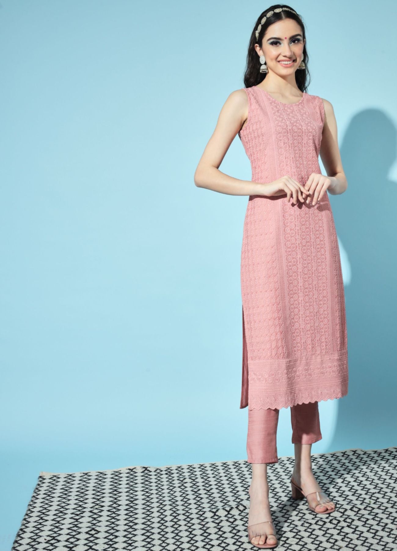 Elevate your ethnic wardrobe with this stunning embroidered kurta suit, designed to make a statement at any occasion. The calf-length kurta features intricate embroidery and sequinned ornamentation, complemented by a flattering round neck and sleeveless design for a chic look. Paired with solid, slip-on pants that offer comfort with an elasticated waistband, this ensemble is both stylish and practical. The included solid dupatta, adorned with playful tassels, adds a touch of elegance to your outfit. Perfect for festive celebrations or casual gatherings, this kurta suit is a must-have for the modern woman who values both tradition and style.