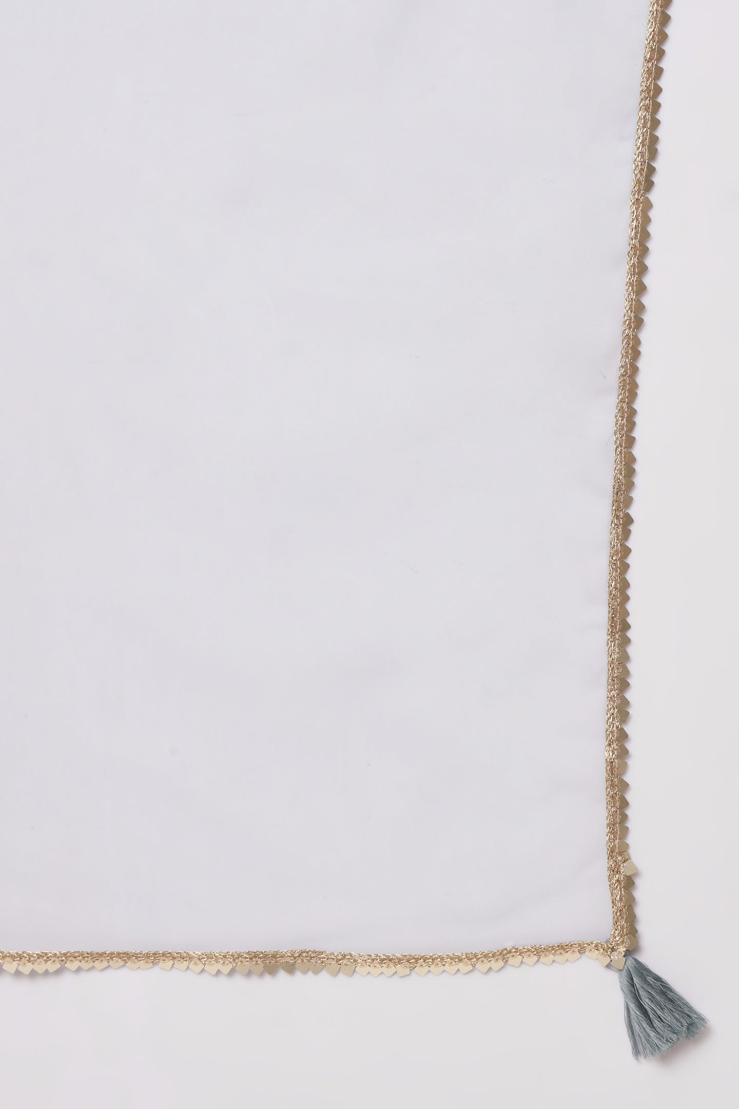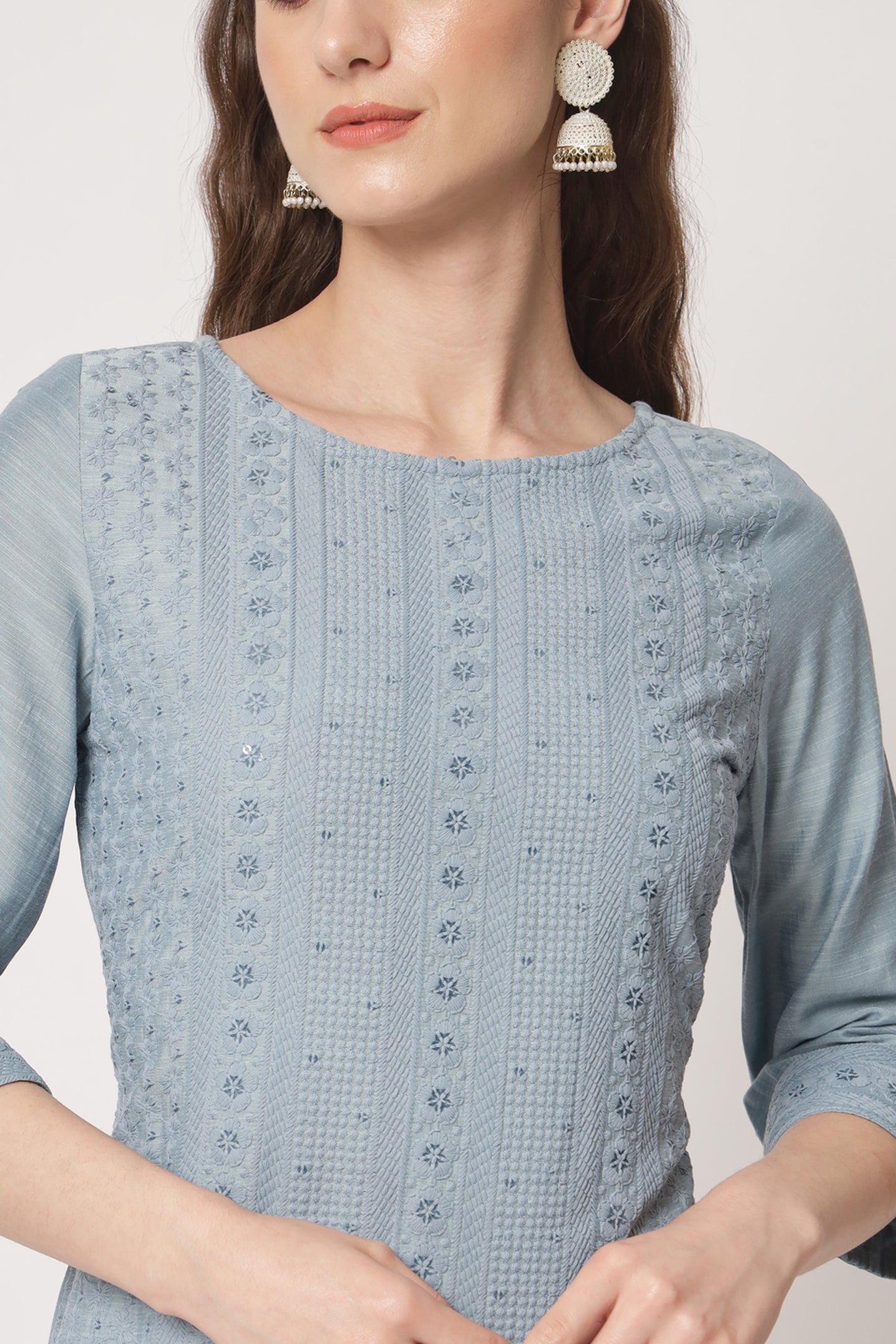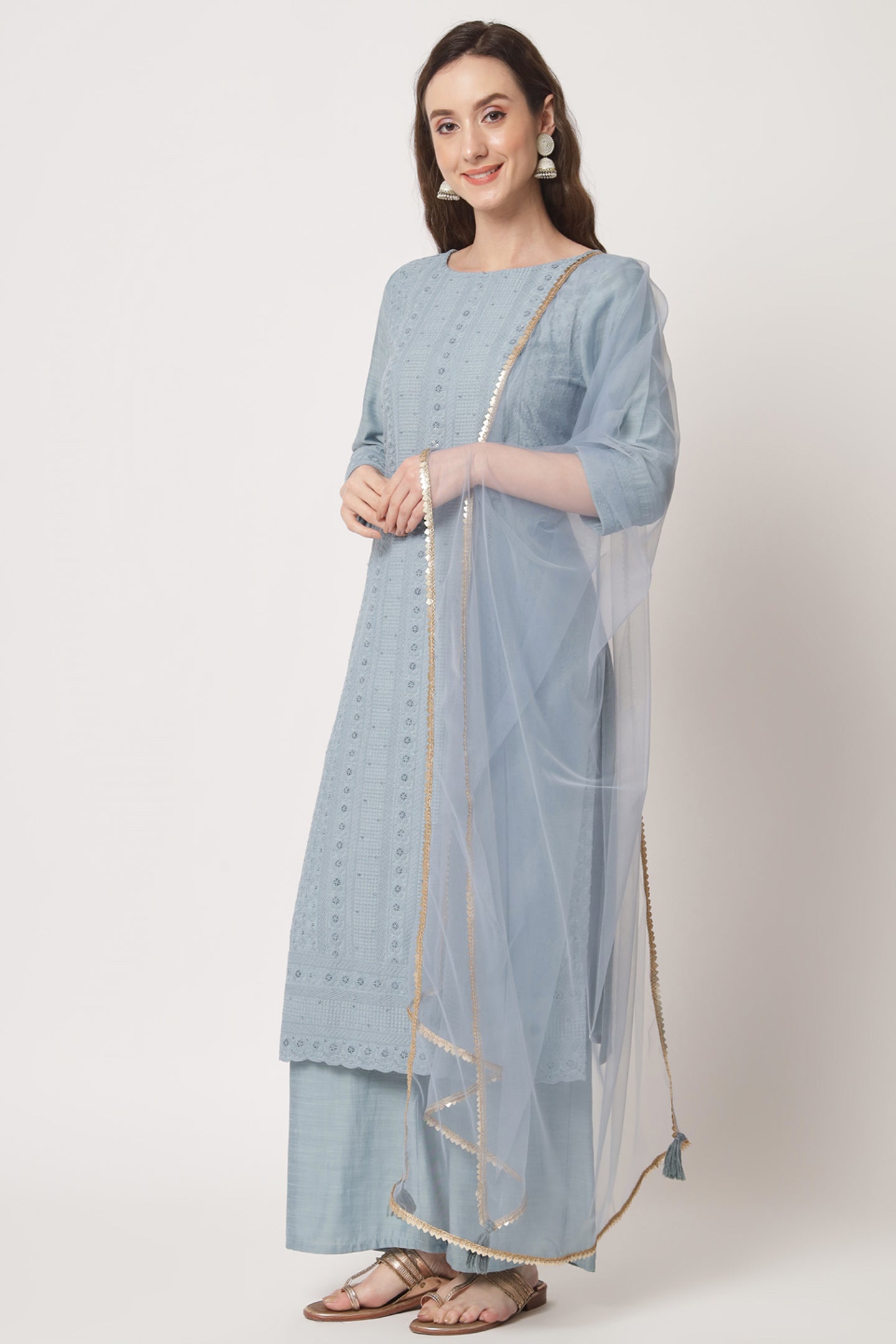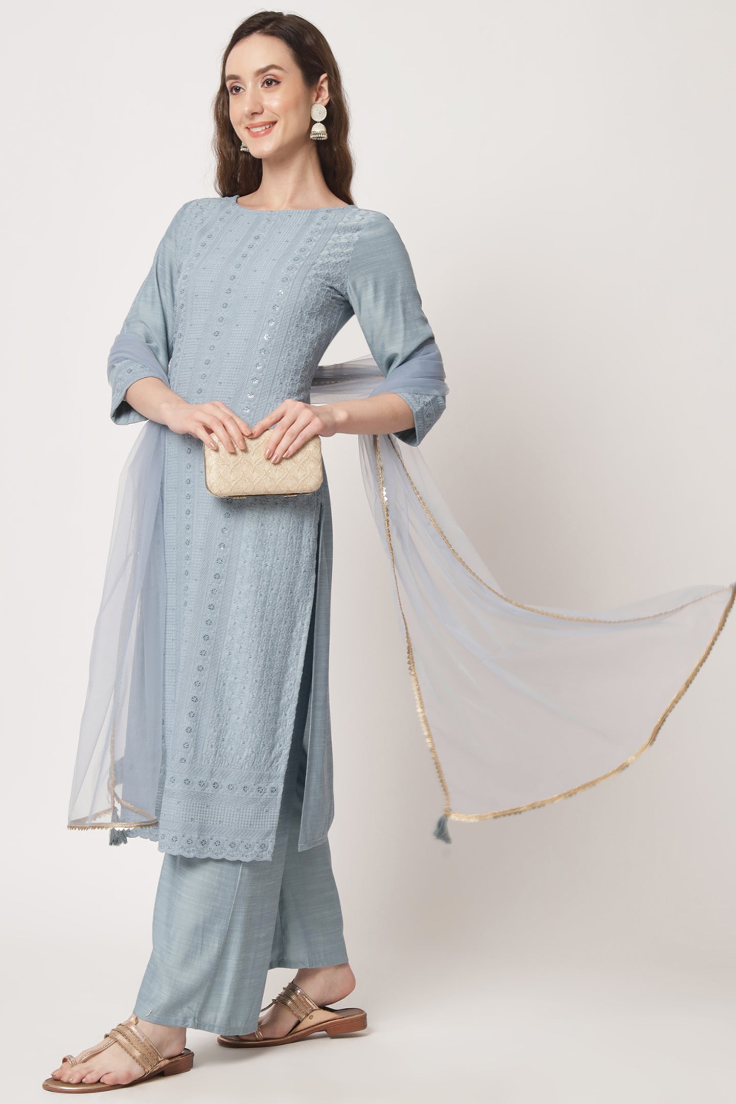 Elevate your ethnic wardrobe with this stunning embroidered kurta set, designed to make a statement at any occasion. The calf-length kurta features a straight silhouette with a sophisticated boat neck and 3/4 sleeves, adorned with exquisite sequinned embroidery that adds a touch of elegance. Paired with solid palazzo pants that offer comfort and style, this ensemble is perfect for both festive celebrations and casual gatherings. The included dupatta, crafted from soft fabric and finished with charming tassels, completes the look, making it a versatile addition to your collection. Embrace tradition with a modern twist and step out in confidence with this beautiful kurta set.