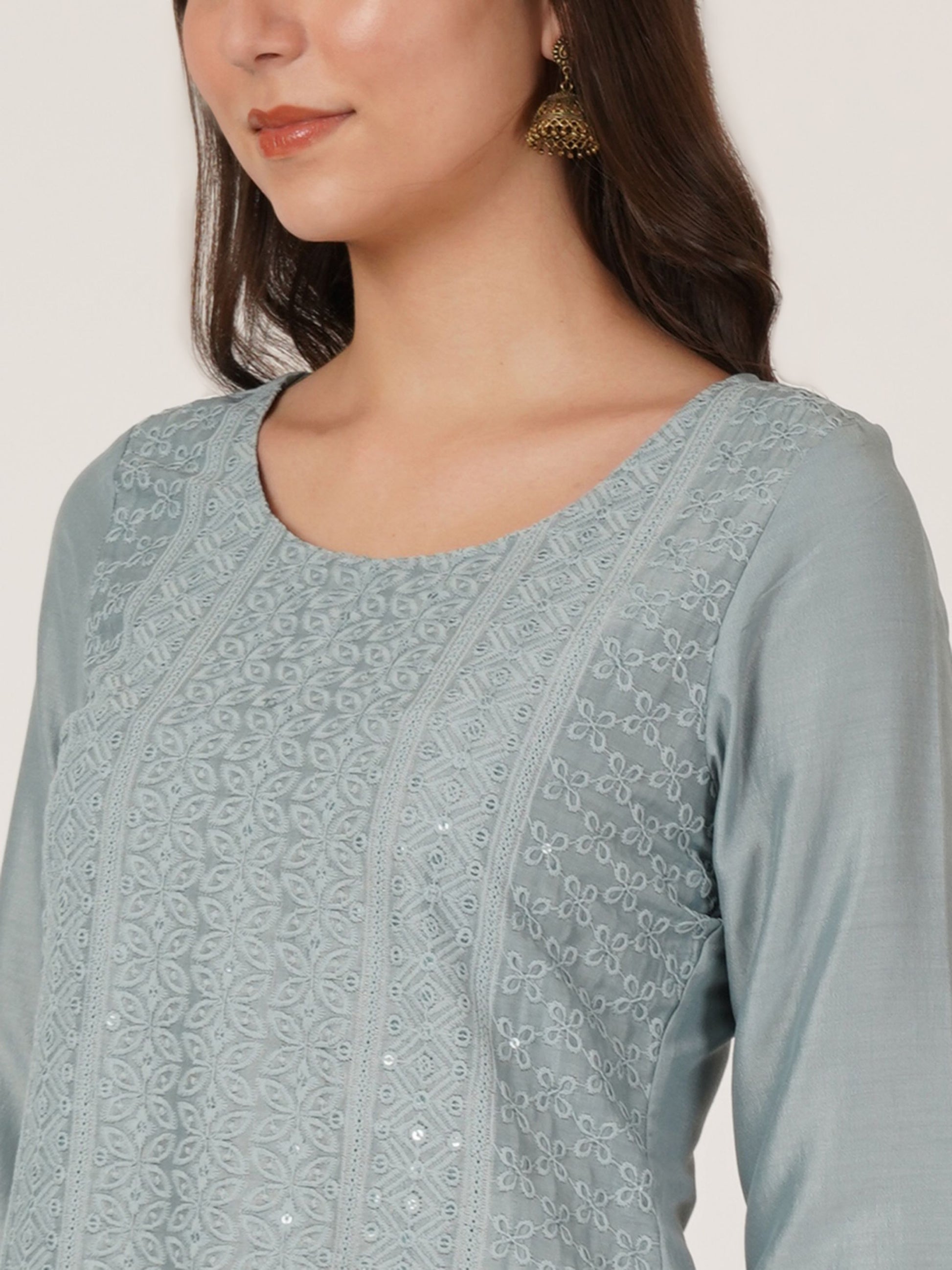 Elevate your wardrobe with our exquisite Embroidered Suit, designed to blend elegance and comfort seamlessly. The knee-length kurta features intricate embroidery and sequinned ornamentation, complemented by a flattering round neck and stylish 3/4 sleeves. The solid pants with an elasticated waistband ensure a perfect fit, while the included dupatta, adorned with a delicate lace border, adds a touch of sophistication to your ensemble. Perfect for festive occasions or casual gatherings, this suit is a must-have for the modern woman who values both style and grace.