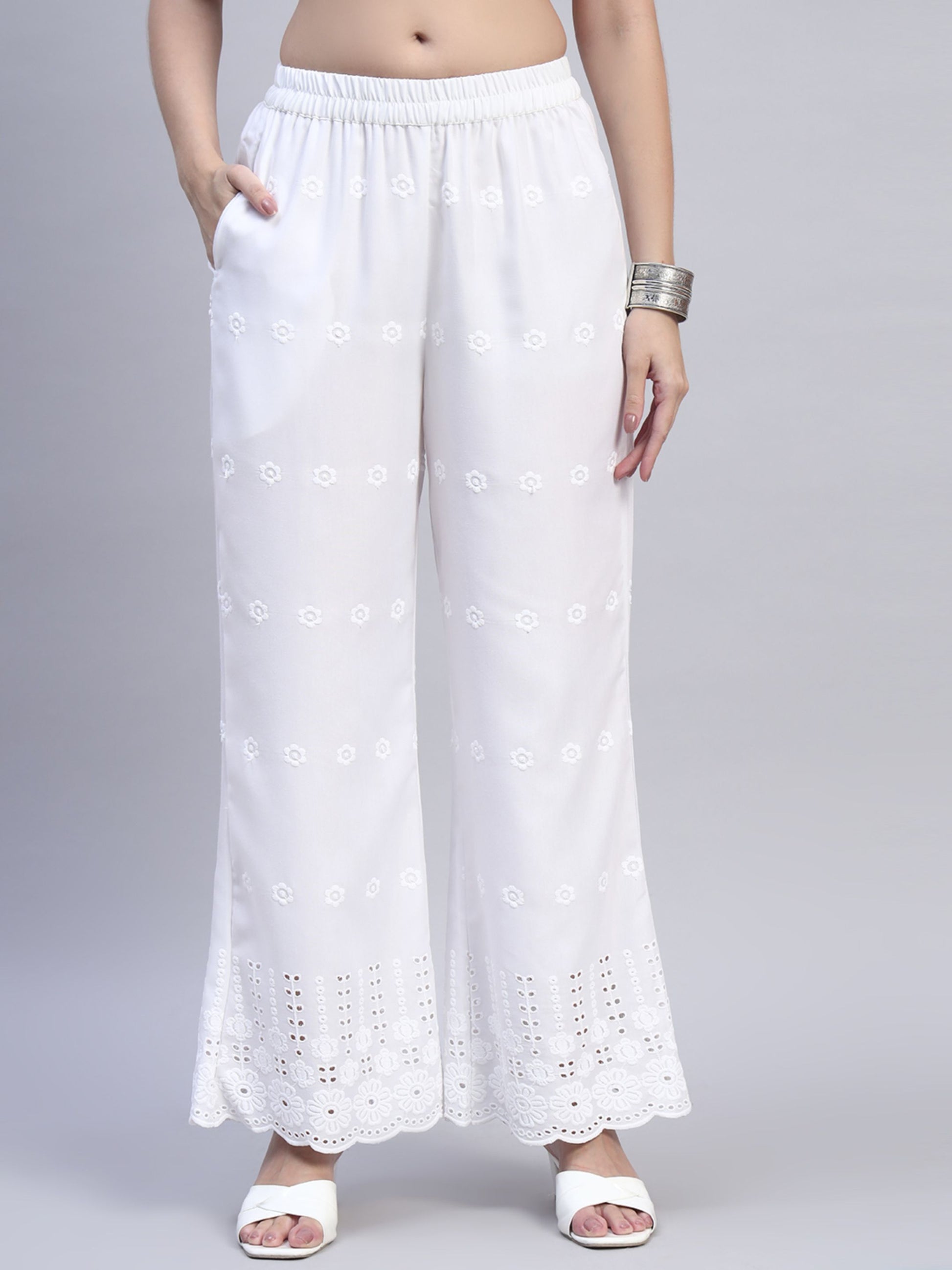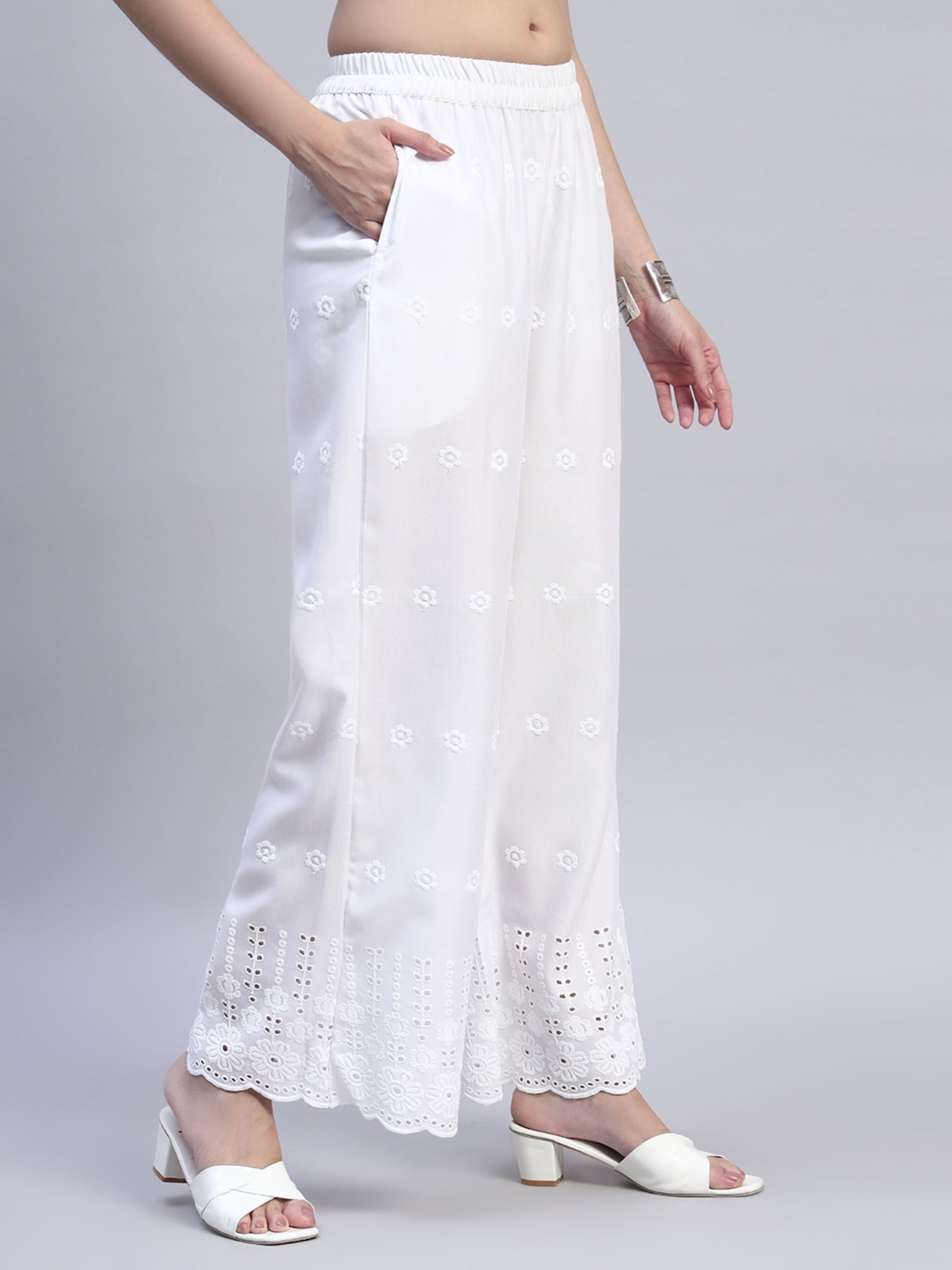 White Chikankari Cotton blend Women's Palazzo