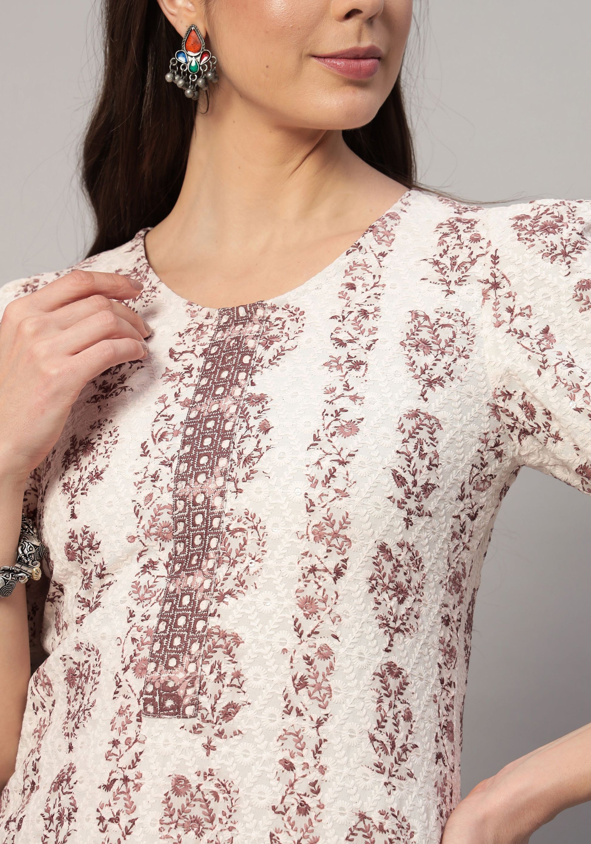 Elevate your ethnic wardrobe with this stunning printed suit, designed to make a statement. The knee-length kurta features exquisite embroidery, a flattering straight shape, and a comfortable V neck, complemented by elegant 3/4 sleeves. Paired with solid dhoti pants that offer a slip-on closure and an elasticated waistband for ease of wear, this ensemble ensures both style and comfort. The included solid dupatta, adorned with a plain border and delicate lace ornamentation, adds a touch of sophistication. Perfect for festive occasions or casual gatherings, this suit is a must-have for the modern woman who values elegance and grace.