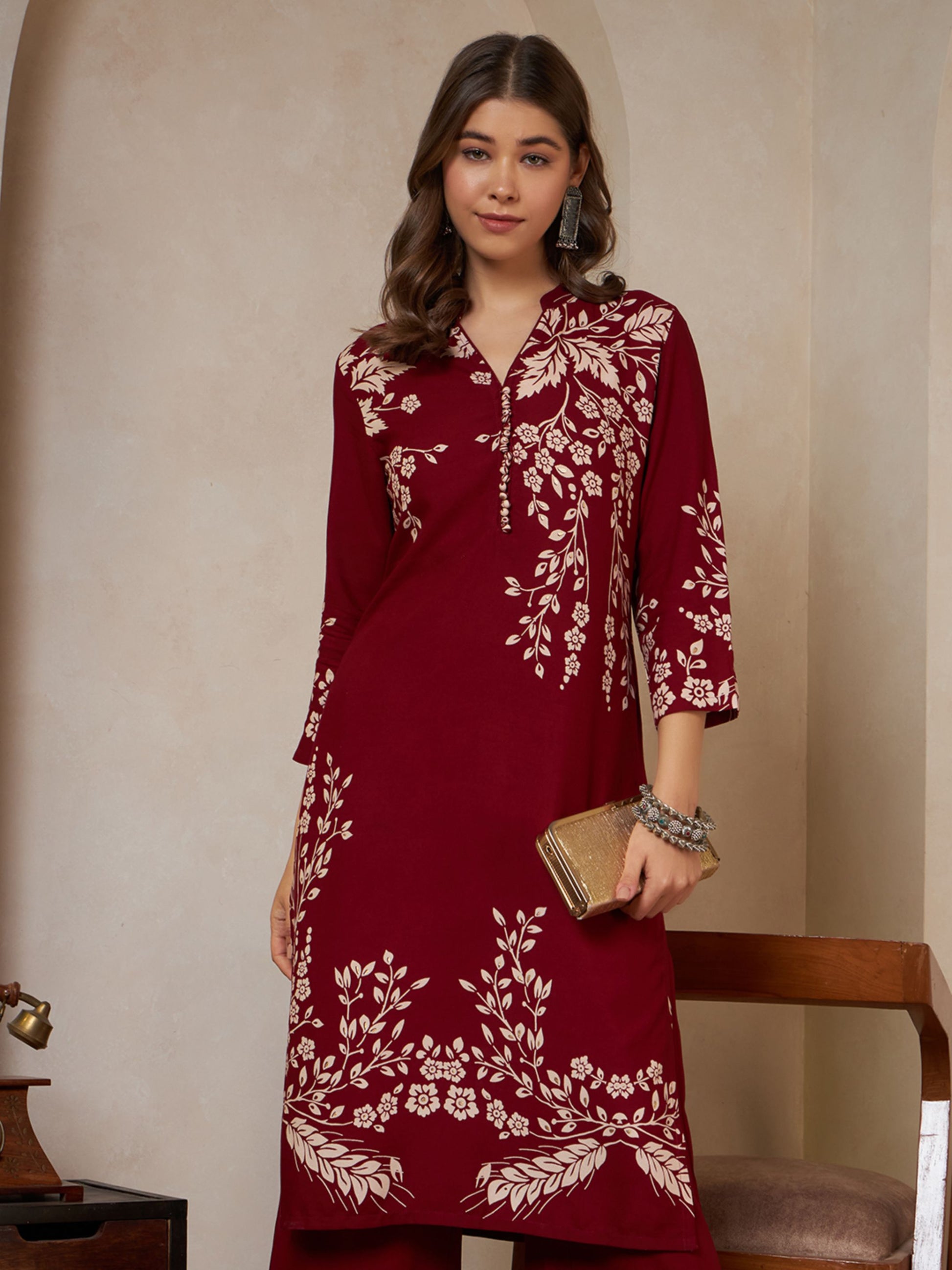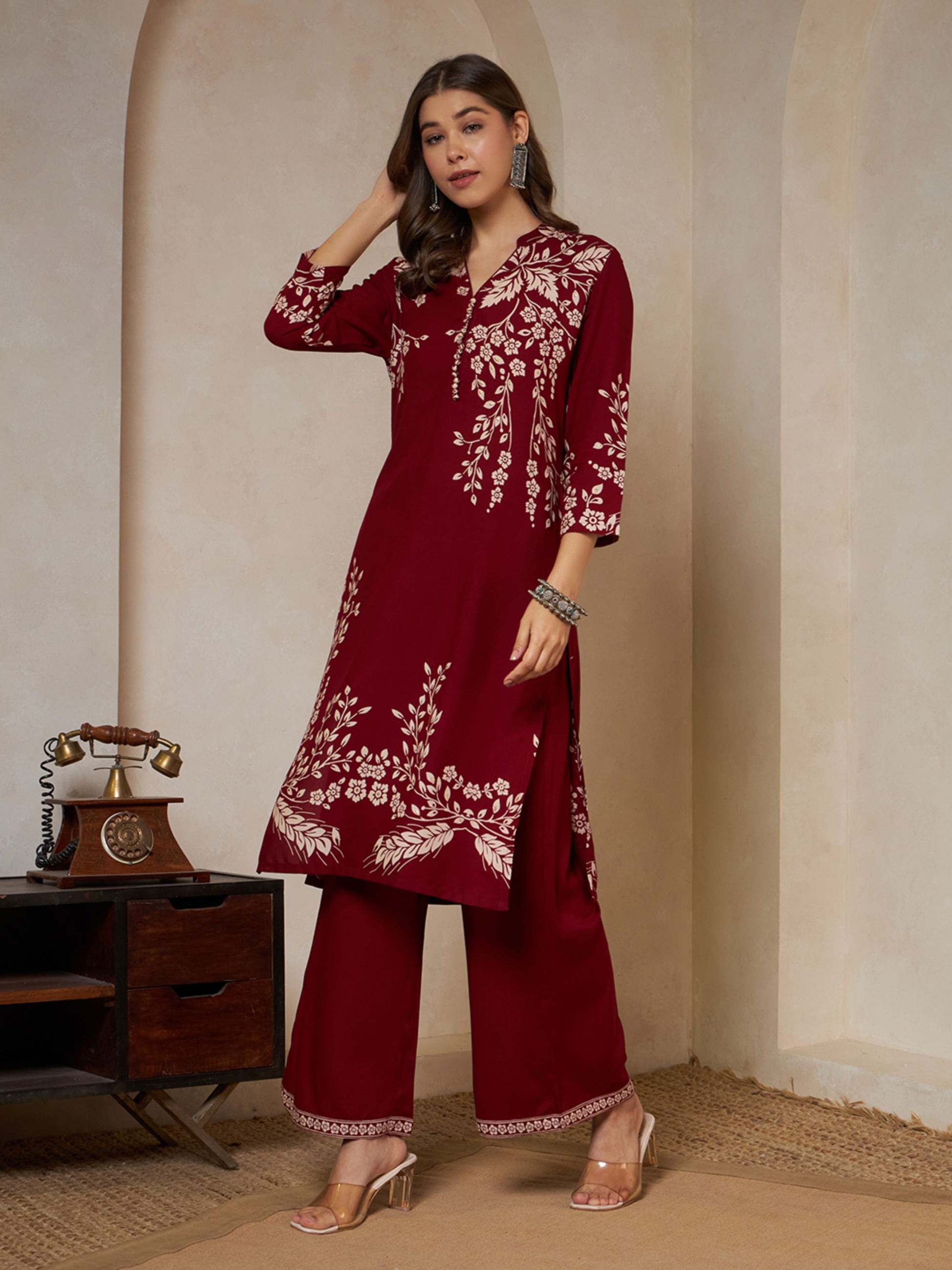 Wine Printed Rayon Women's Kurta and Palazzo Set