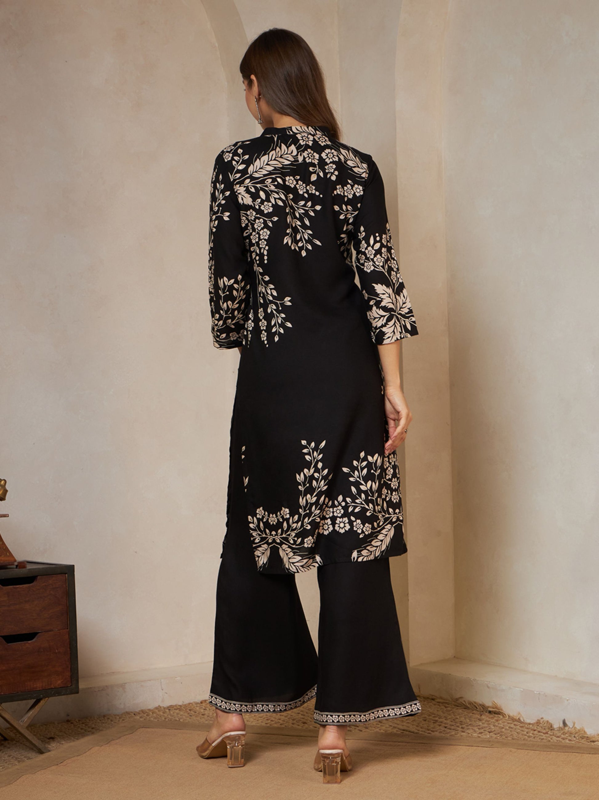 Elevate your ethnic wardrobe with this stunning Embroidered kurta set, crafted from soft, breathable rayon for all-day comfort. The calf-length kurta features a straight silhouette with a stylish mandarin neck and elegant 3/4 sleeves, adorned with intricate printed patterns that add a touch of sophistication. Paired with a solid palazzo that boasts an Elasticated Waistband for a perfect fit, this ensemble is ideal for festive occasions or casual gatherings. Embrace effortless style and grace with this beautiful kurta set, which includes one kurta and one palazzo in the package.