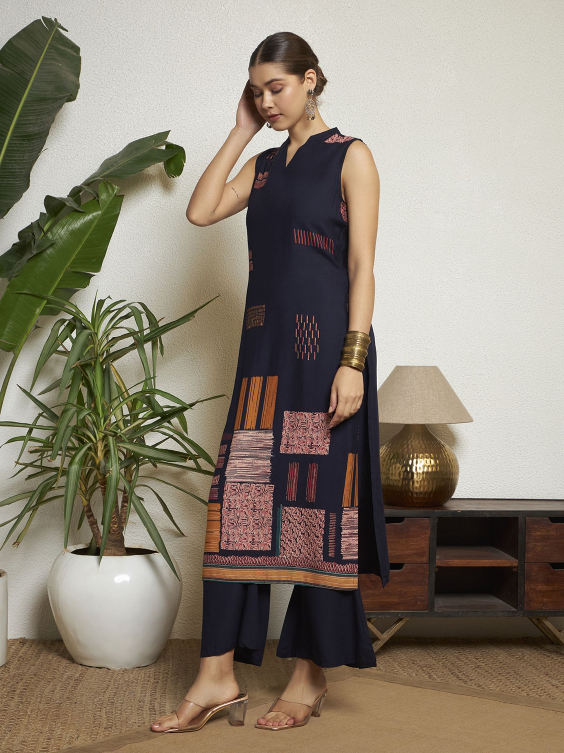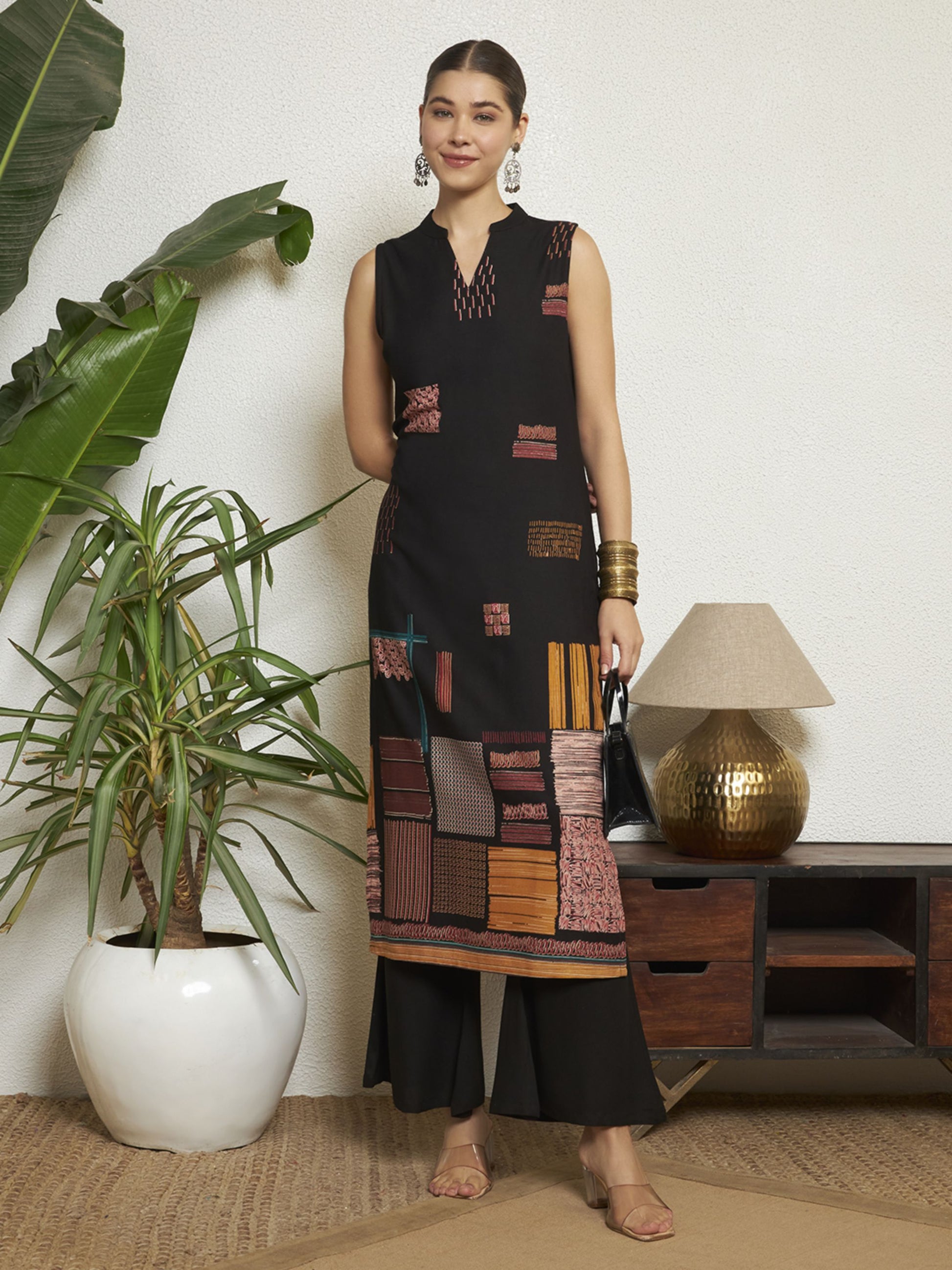 Elevate your wardrobe with this stunning Kurta and Palazzo set, perfect for any occasion. The calf-length kurta features a stylish mandarin neck and a beautiful printed design that adds a touch of elegance to your look. Its sleeveless style ensures comfort and breathability, while the solid palazzo with an elasticated waistband offers a flattering fit and ease of movement. This versatile ensemble is not only chic but also practical, making it a must-have addition to your collection. The package includes one kurta and one Palazzo, ready to make a statement wherever you go.