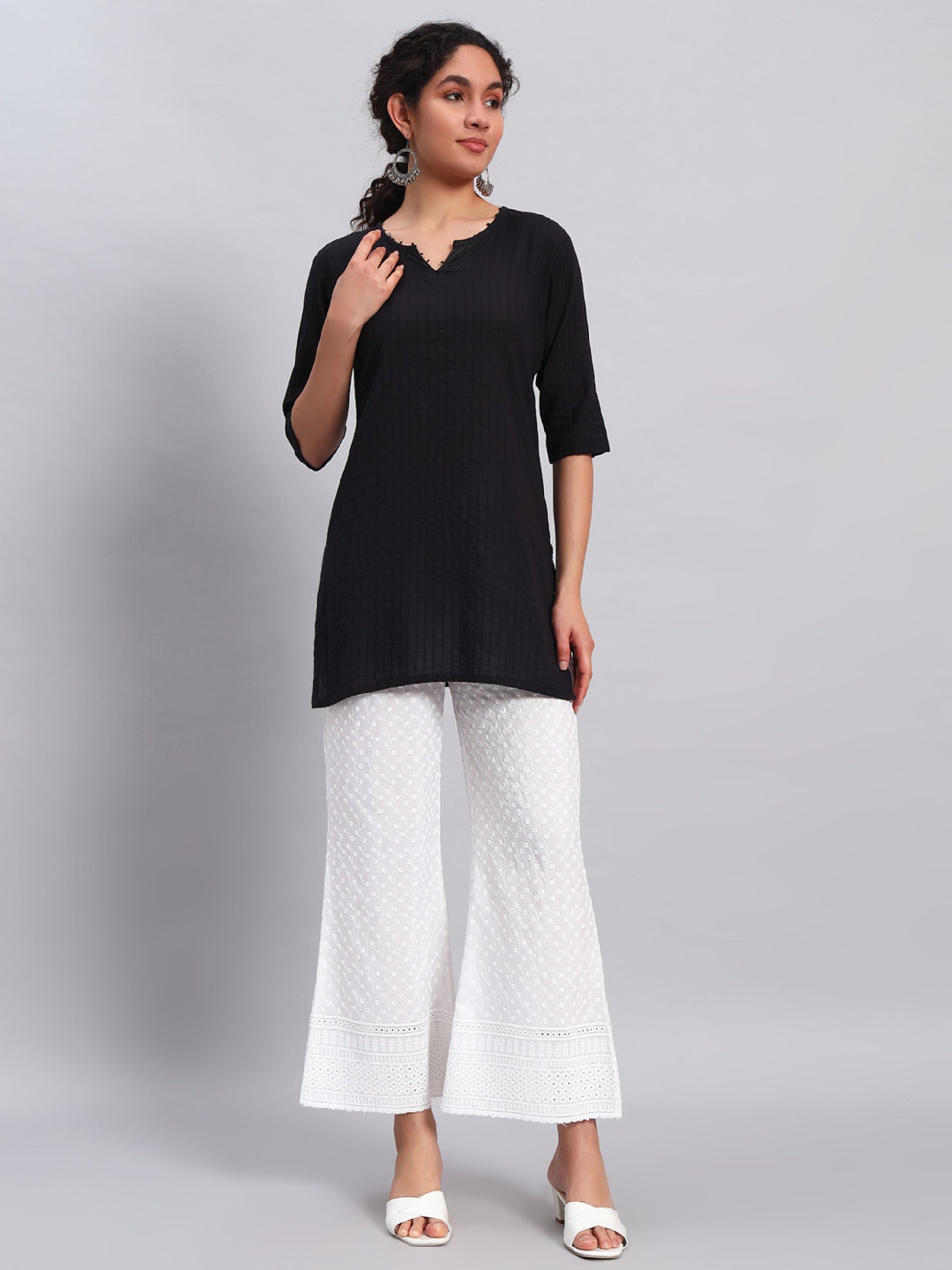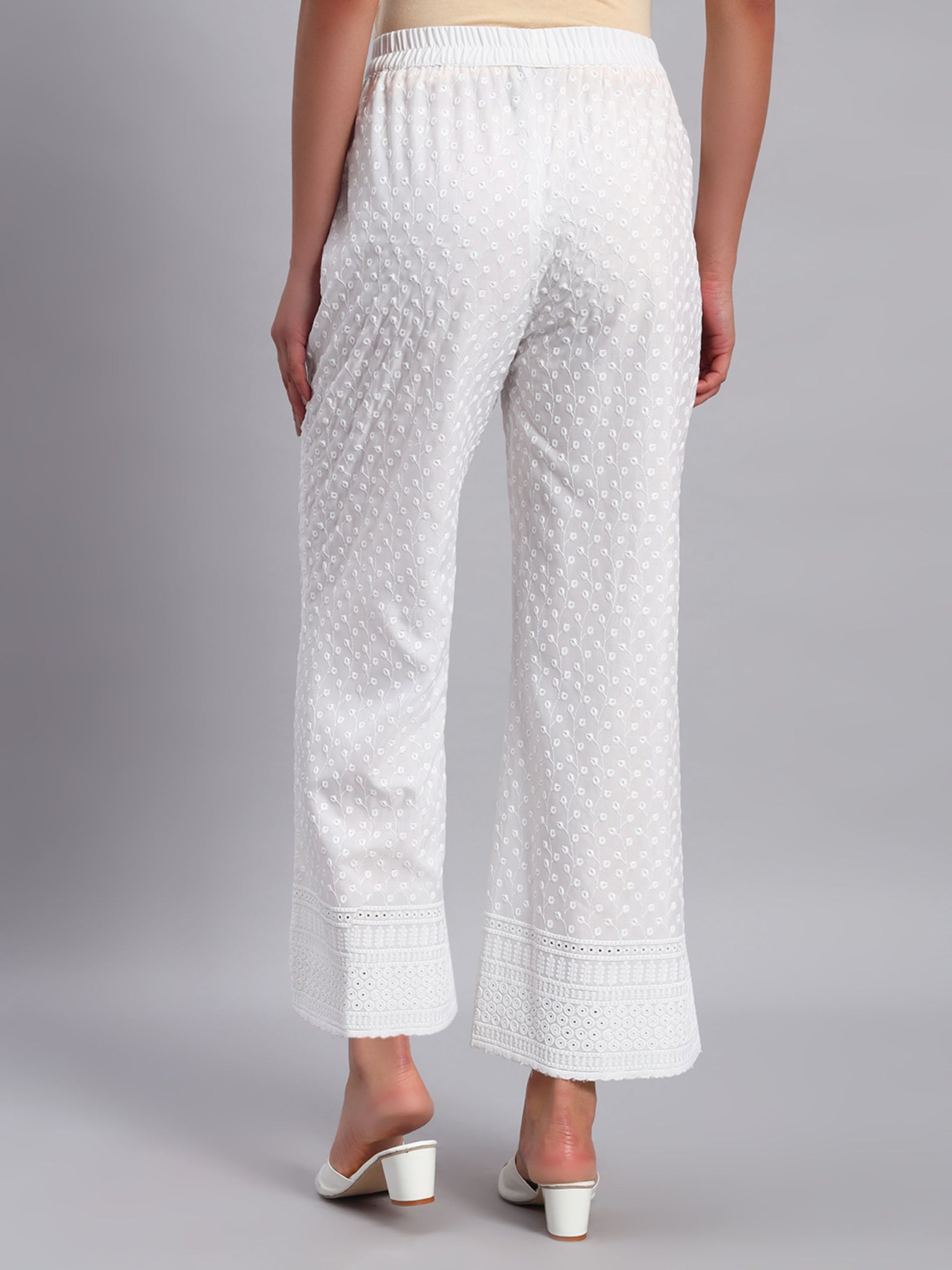 Elevate your wardrobe with our exquisite white cotton wide-leg palazzo pants, designed for both comfort and style. Featuring a solid pattern and an elasticated waistband, these slip-on pants offer a relaxed fit that flatters all body types. The intricate embroidery adds a touch of sophistication, making them perfect for both casual outings and more formal occasions. With a regular length that pairs beautifully with any top, this versatile piece is a must-have addition to your collection. Enjoy effortless elegance and unmatched comfort with this essential palazzo.