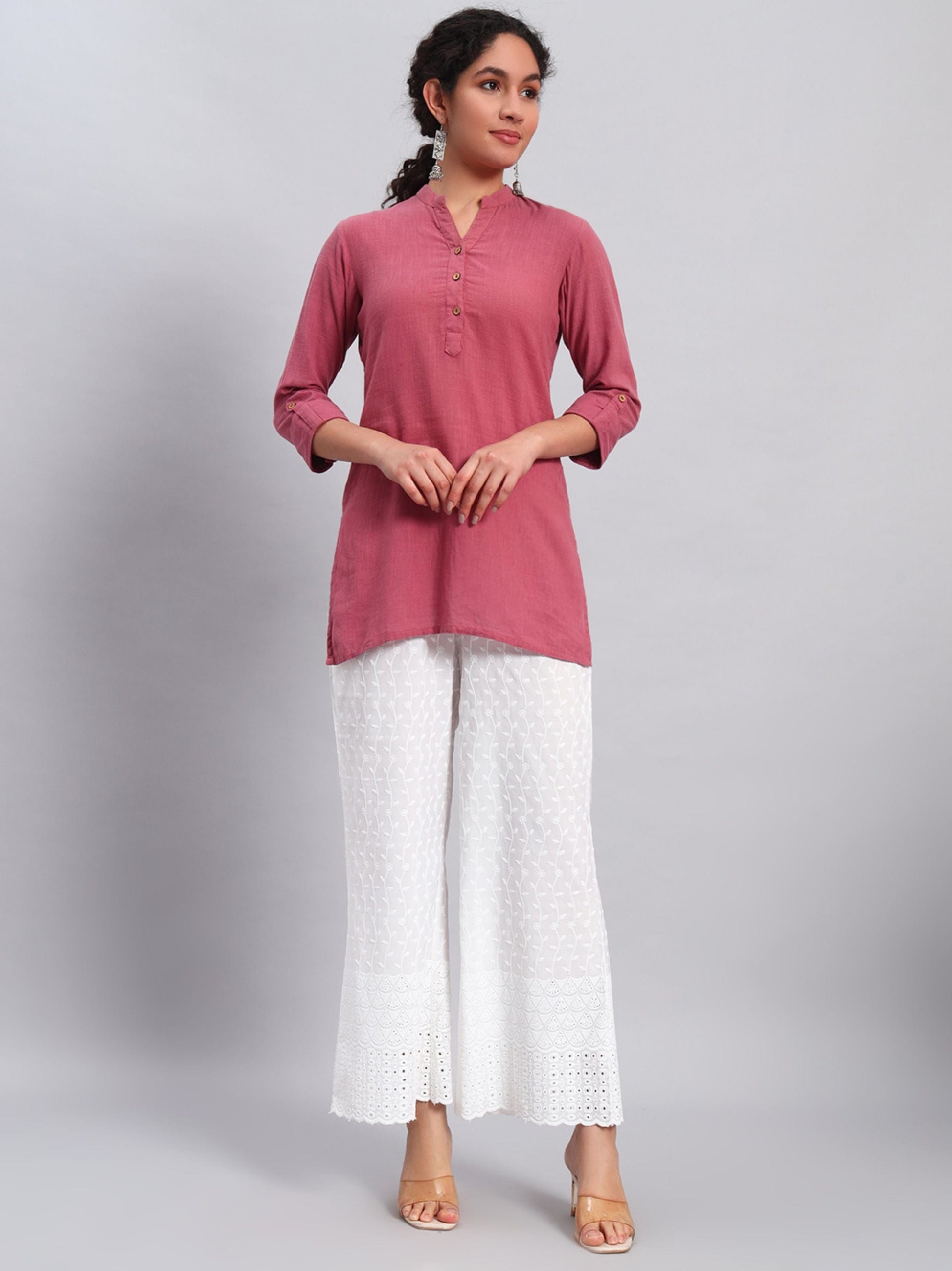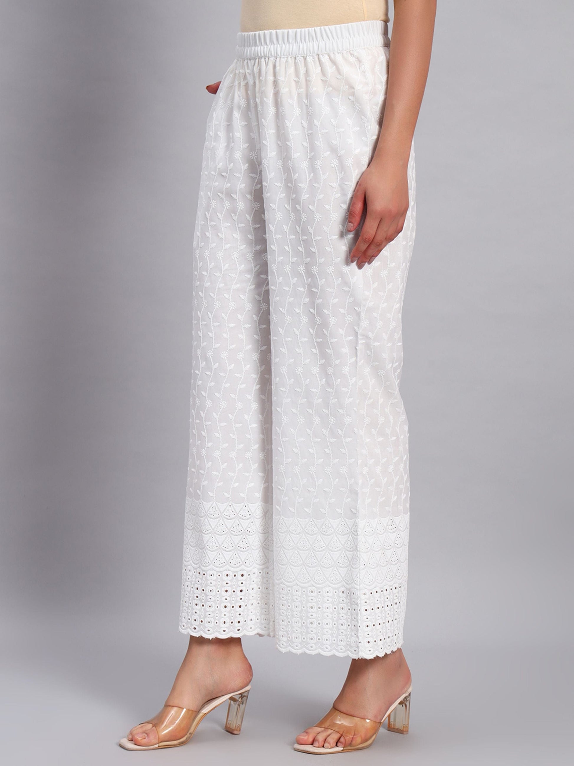 Elevate your wardrobe with our exquisite white cotton wide-leg palazzo pants, designed for both comfort and style. Featuring a solid pattern and an elasticated waistband, these slip-on pants offer a relaxed fit that flatters all body types. The intricate embroidery adds a touch of sophistication, making them perfect for both casual outings and more formal occasions. With a regular length that pairs beautifully with any top, this versatile piece is a must-have addition to your collection. Enjoy effortless elegance and unmatched comfort with this essential palazzo.