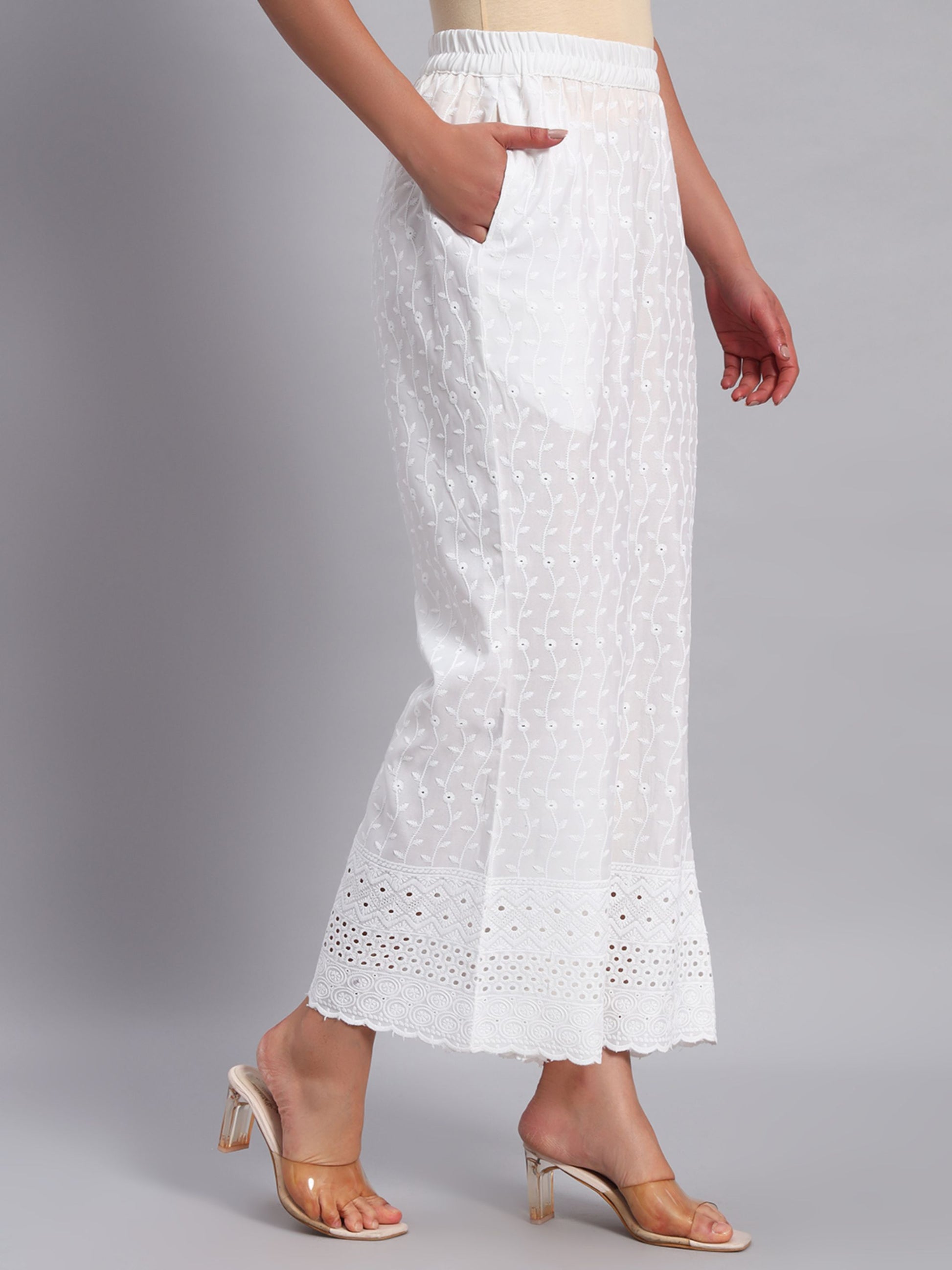 Elevate your wardrobe with our exquisite white cotton wide-leg palazzo pants, designed for both comfort and style. Featuring a solid pattern and an elasticated waistband, these slip-on pants offer a relaxed fit that flatters all body types. The intricate embroidery adds a touch of sophistication, making them perfect for both casual outings and more formal occasions. With a regular length that pairs beautifully with any top, this versatile piece is a must-have addition to your collection. Enjoy effortless elegance and unmatched comfort with this essential palazzo.